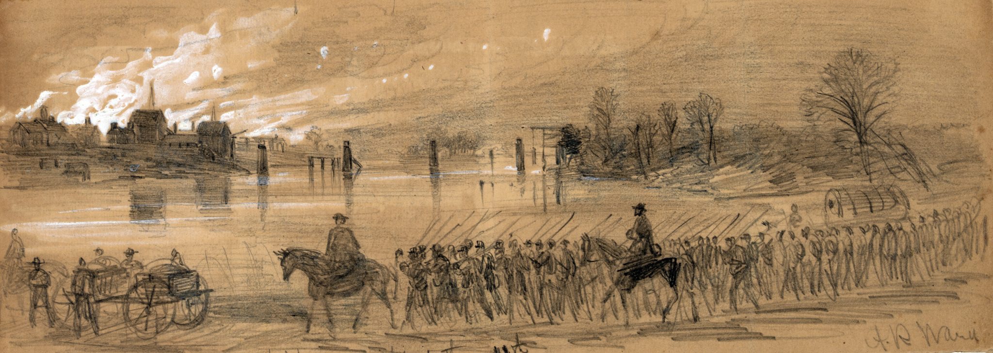 Thursday 11—Started at 12 midnight and reached the landing at 4 a.m. Our Brigade is guarding the pontoon corps who are laying two bridges a mile below Fredericksburg. The town is being burned down. Very heavy cannonading. Franklin’s Corps commenced crossing at sunset. No resistance but a little skirmishing.