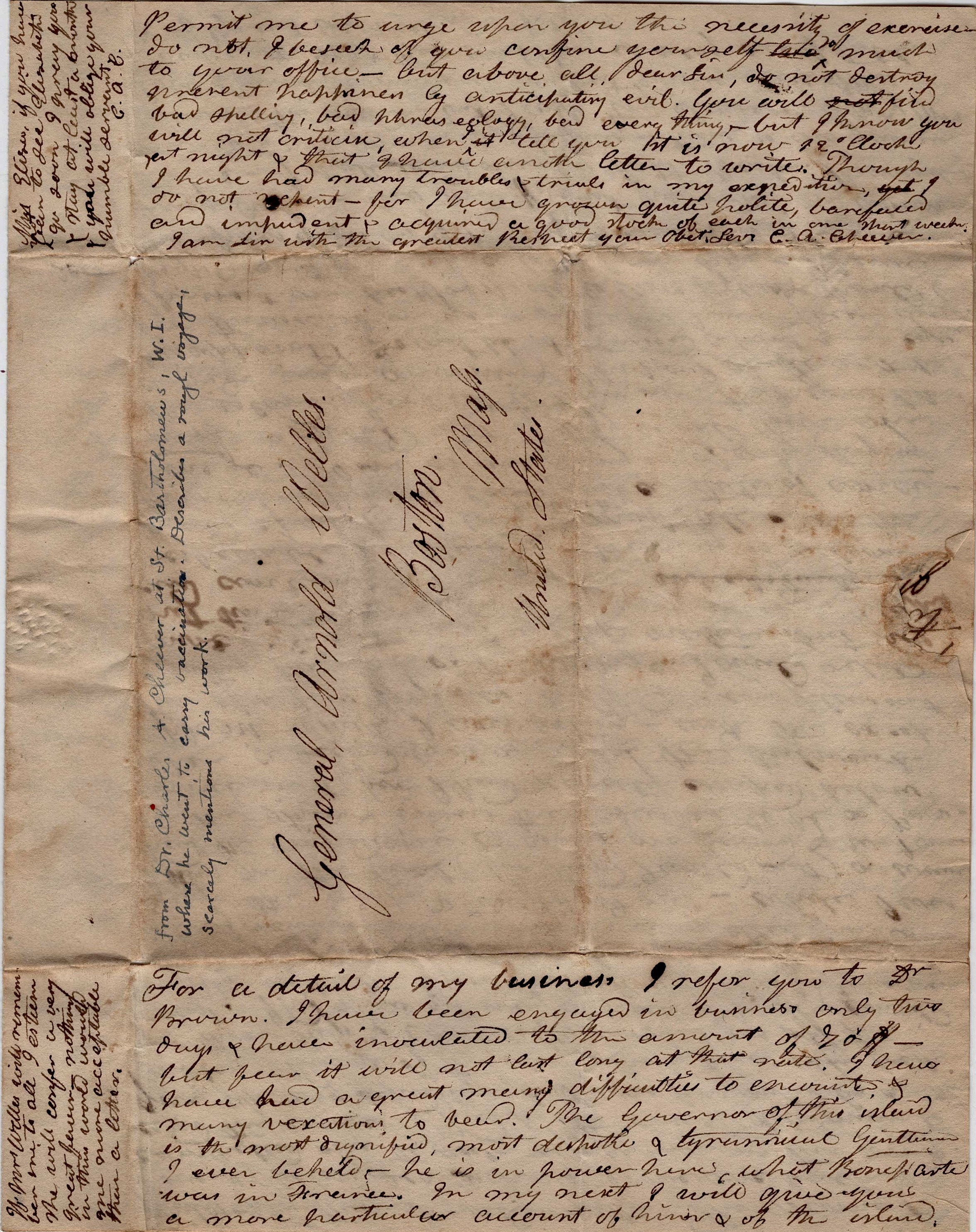 The following letter was written by Dr. Charles Augustus Cheever (1793-1852), the son of Dr. Abijah Cheever. It describes his sea voyage to St. Bartholomew (St. Barts) to perform vaccinations, presumably for small pox. In datelining his letter, Dr. Cheever failed to write the year. In a book published in 1854 under the title, “Extracts from the writings of Charles A. Cheever,” it is stated that Charles made his voyage to the West Indies “for the purpose of introducing vaccination as a preventative for the smallpox” and this trip was made during the period he worked for Dr. Brown of Boston in the Spring of 1815 and the autumn of 1816 when he moved to New Hampshire.