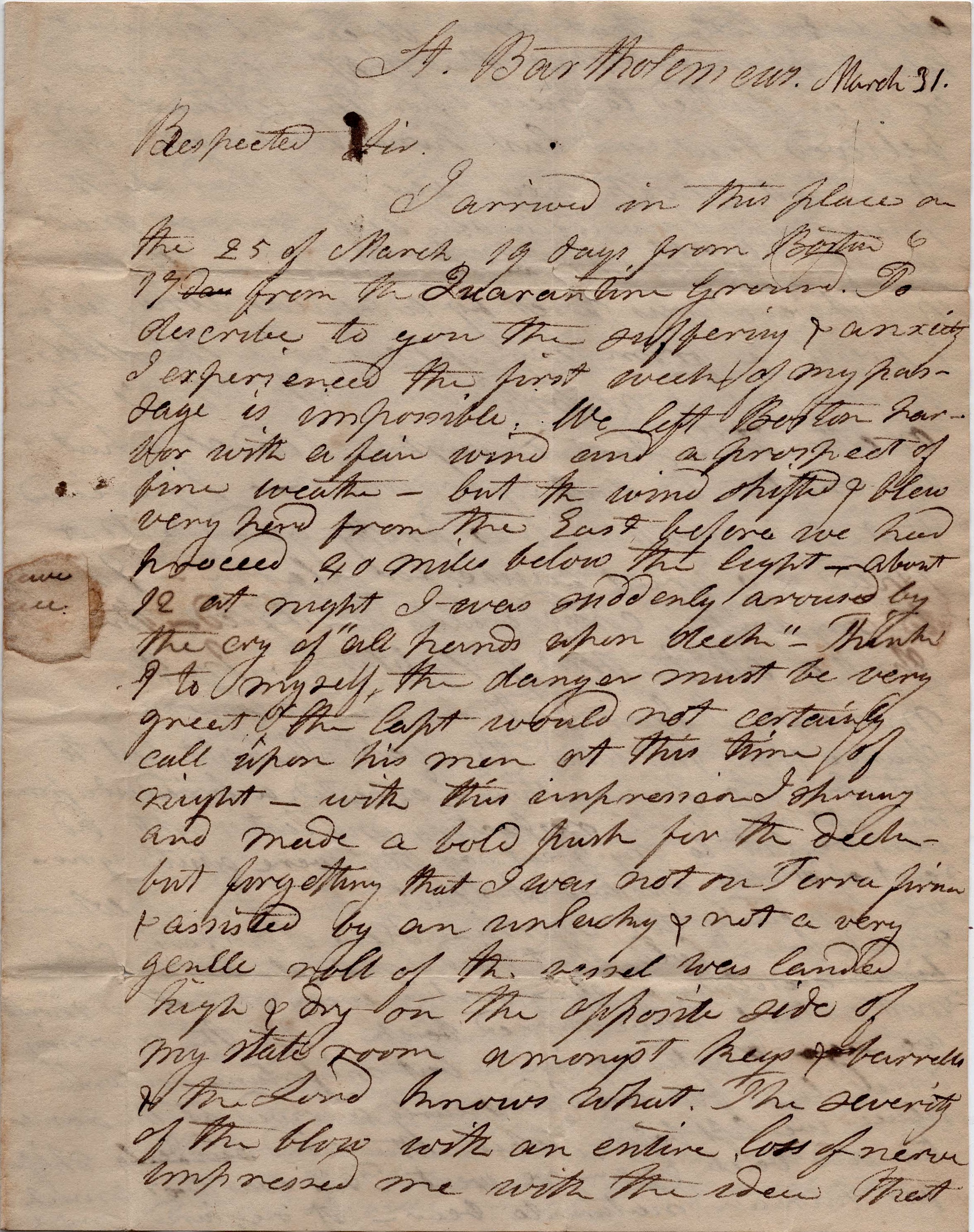 I arrived in this place on the 25th of March, 19 days from Boston and 17 from the Quarantine ground. To describe to you the suffering & anxiety I experienced the first week of my passage is impossible. We left Boston Harbor with a fair wind a prospect of fine weather—but the wind shifted and blew very hard from the east before we had proceeded 40 miles below the light. About 12 at night I was suddenly aroused by the cry of “All hands upon deck!” Thinks I to myself, the danger must be very great or the Captain would not certainly call upon his men at this time of night. With this impression, I sprung and made a bold push for the deck forgetting that I was not on terra firma and assisted by an unlucky and not a very gentle roll of the vessel, was landed high and dry on hte opposite side of my state room amongst kegs & barrels & the Lord knows what. The severity of the blow with an entire loss of nerve impressed me with the idea that all was lost—that some dreadful accident had happened—that the ship was foundered or was dashed to pieces upon the rocks. I verily believed that my last hour had come.