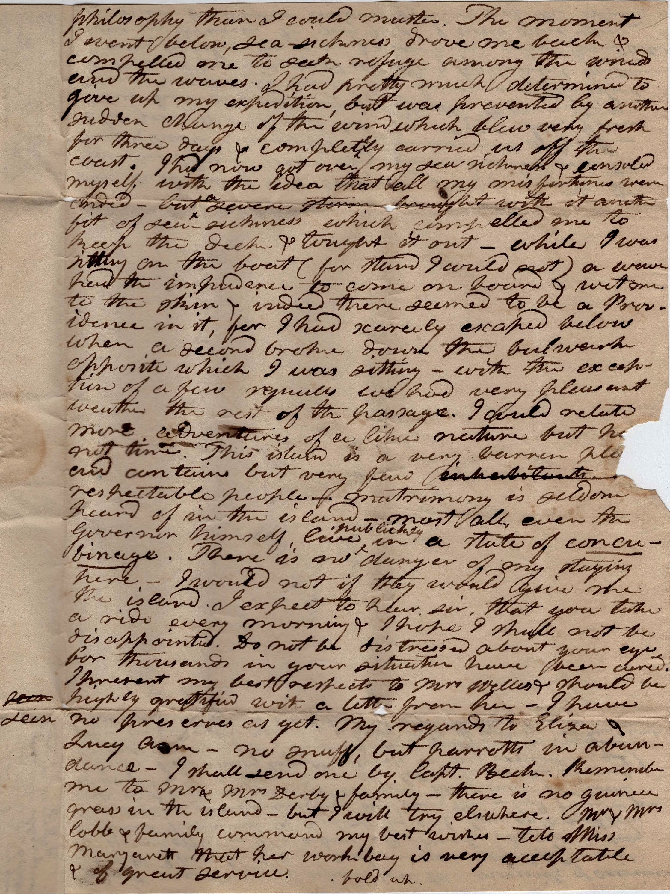 This island is a very barren place and contains but very few respectable people. Matrimony is seldom heard of in the island. Most all—even the Governor himself—live publicly in a state of concubinage. There is no danger of my staying here. I would not if they would give me the island.
