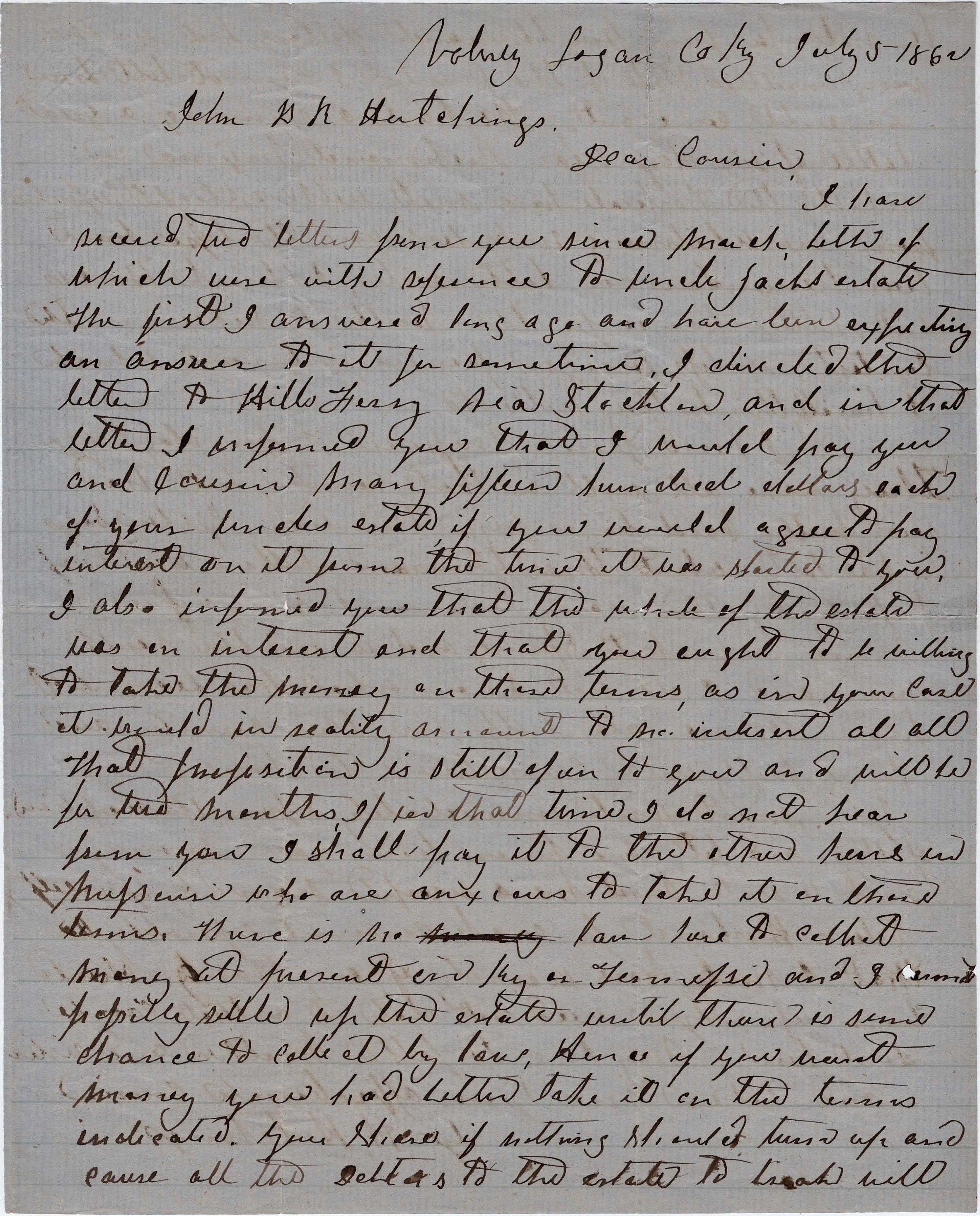 Dear cousin, I have received two letters from you since March, little of which were with reference to Uncle Jack’s estate. The first I answered long ago and have been expecting an answer to it for some time. I directed the letter to Hill’s Ferry via Stockland and in that letter I informed you that I would pay you and cousin Mary fifteen hundred dollars each of your Uncle’s estate if you would agree to pay interest on it from the time it was started to you. I also informed you that the whole of the estate was in interest and that you ought to be willing to take the money on these terms as in your case it would in reality amount to no interest at all. That proposition is still open to you and will be for two months. If in that time I do not hear from you, I shall pay it to the other heirs in [ ] who are anxious to take it on those terms.