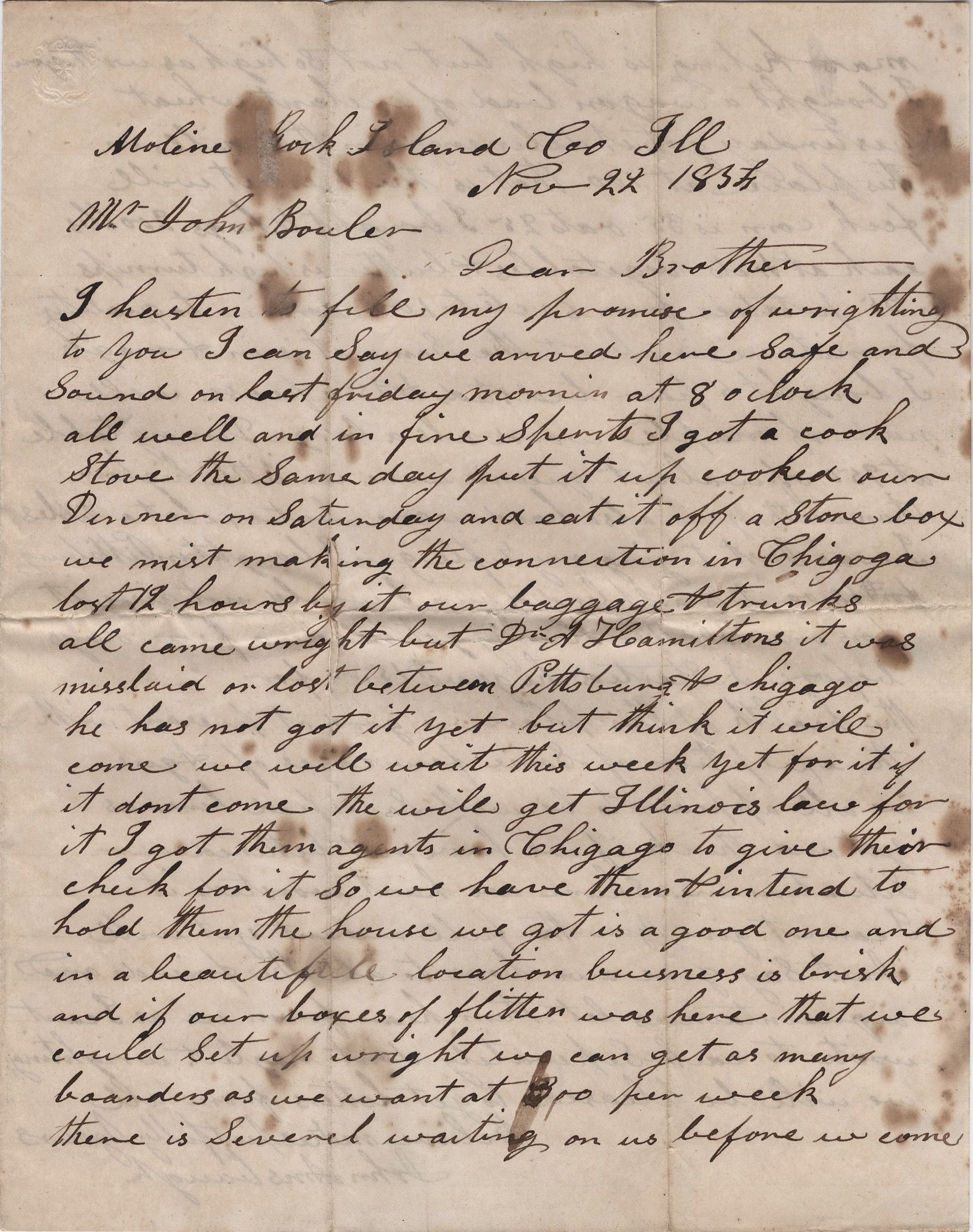 Dear brother, I hasten to fill my promise of writing to you. I can say we arrived here safe and sound on last Friday morning at 8 o’clock, all well and in fine spirits. I got a cook stove the same day, put it up, cooked our dinner on Saturday, and eat it off a store box. We missed making the connection in Chicago [and] lost 12 hours by it. Our baggage and trunks all came right but Dr. A[ndrew] Hamilton’s. It was mislaid or lost between Pittsburgh & Chicago. He has not got it yet but thinks it will come. We will wait this week yet for it. If it don’t come, they will get Illinois law for it. I got them agents in Chicago to give their check for it so we have them and intend to hold them.