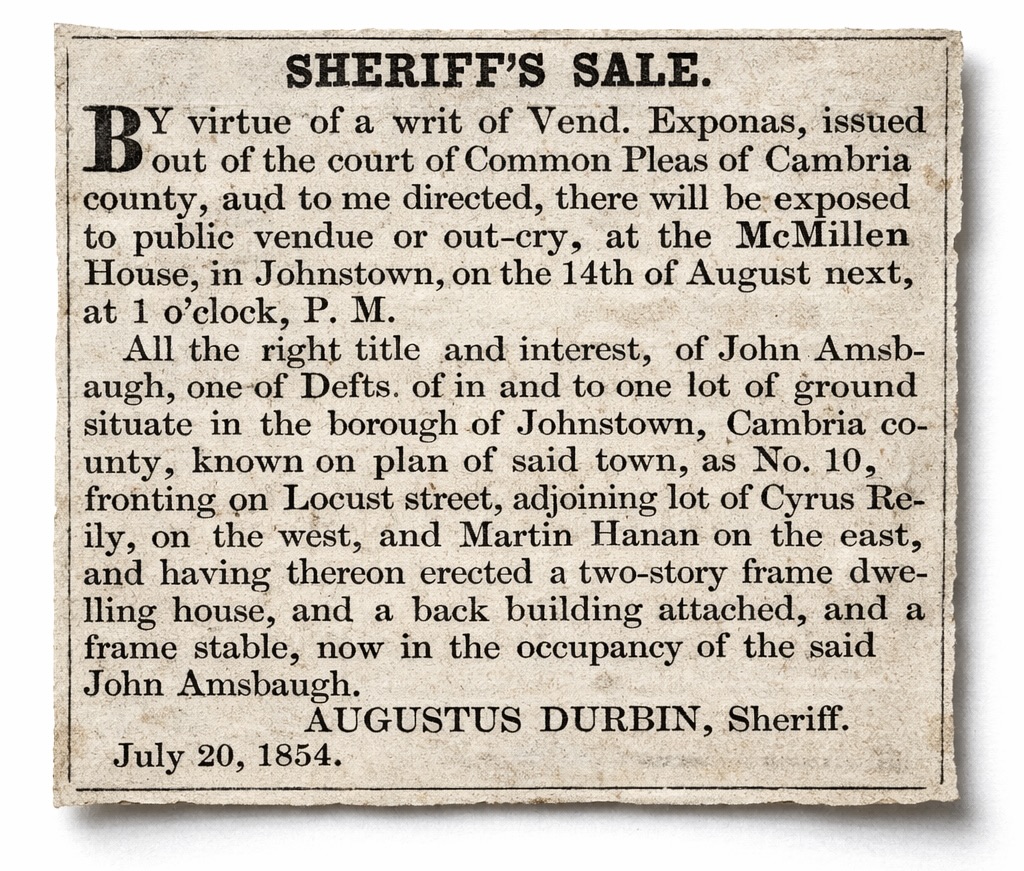 The following letter was written by John R. Amsbaugh (1807-1879), the son of Henry John Amsbaugh (1785-1861) and Elizabeth Hansby (1780-1830) of Pennsylvania. John was married twice, first to Nancy Slick (1816-Bef. 1850) and second to Jane A. Hamilton (1821-18xx). In the 1850 US Census, John was residing in Johnstown, Cambria county, Pennsylvania. He had no occupation at the time. We know that he lived in a two-story frame house with an attached stable on Locust Street in Johnstown because he was required to see the house and lot at auction for unpaid debts in July 1854. Only a year earlier he had purchased the Bennett Hotel in Johnstown and tried to make a go of it, advertising that his bar would serve “a choice selection of wines and liquors of all kinds.”