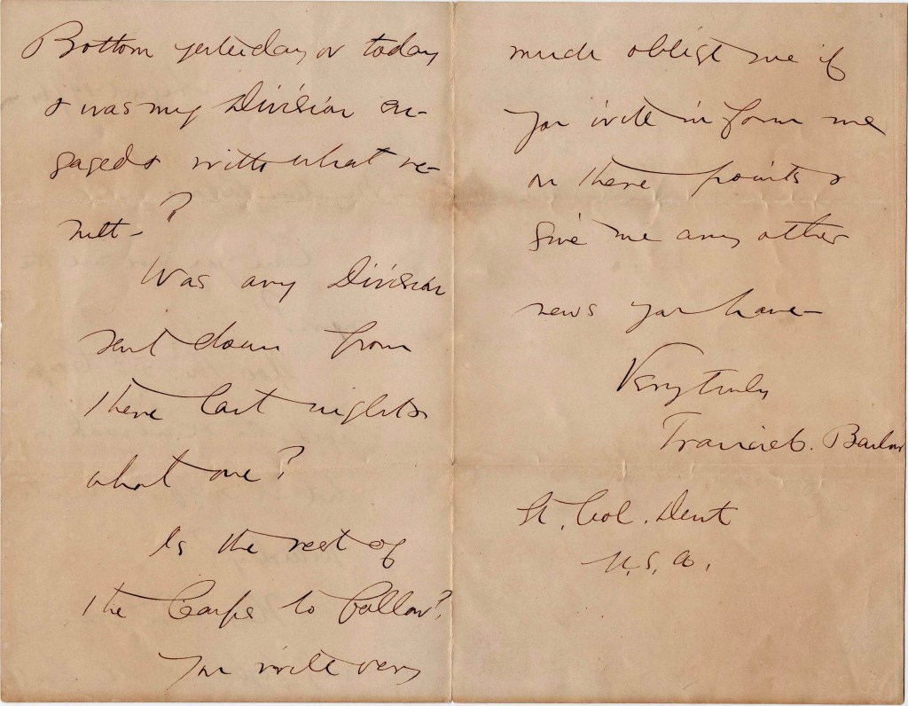 Frank was married to Arabella Wharton Griffin (1824-1864), who was ten years his senior. They married shortly after the firing on Fort Sumter at St. Paul’s Chapel in New York City. After months apart, Arabella volunteered as a nurse, arriving at Antietam just in time to see her wounded husband. When Frank was wounded again at Gettysburg, Arabella tended to him once more. In 1864, she accompanied him to the front, but while working in a field hospital in Tidewater Virginia, she contracted typhus and became critically ill. She died on July 28, 1864, after being transported to a vessel at City Point. Her death caused Frank immense grief, leading to concerns among his associates about his mental state. He received a 15-day furlough to attend her funeral but delayed his return due to exhaustion. This letter, written during that time, shows his anxiety to learn about his 2nd Corps Division’s movements. [See The Wives of Francis Channing Barlow]
