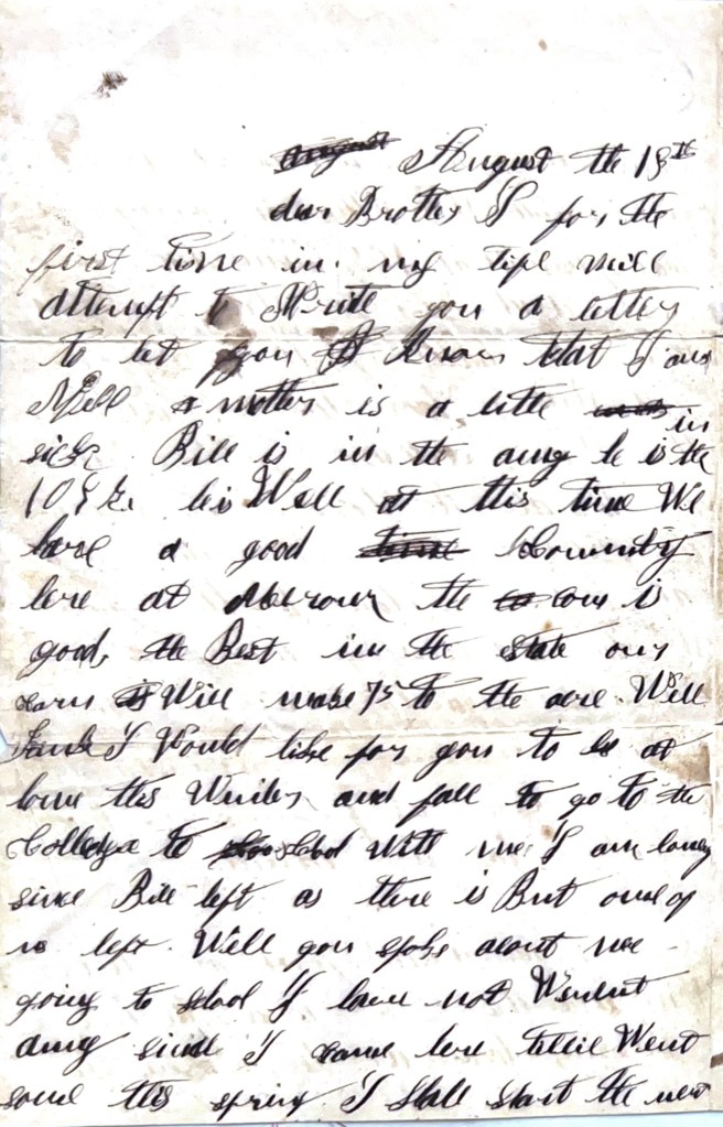 I for the first time in my life will attempt to write you a letter to let you know that I am well & Mother is a little sick. Bill is in the army. He is in the 109th. 1 He is well at this time. We have a good country [?] here at [ ]. The corn is good—the best in the State. Our corn will make 75 to the acre. Well, Frank, I would like for you to be at home this winter and fall to go to the College to school with me. I am lonely since Bill left.