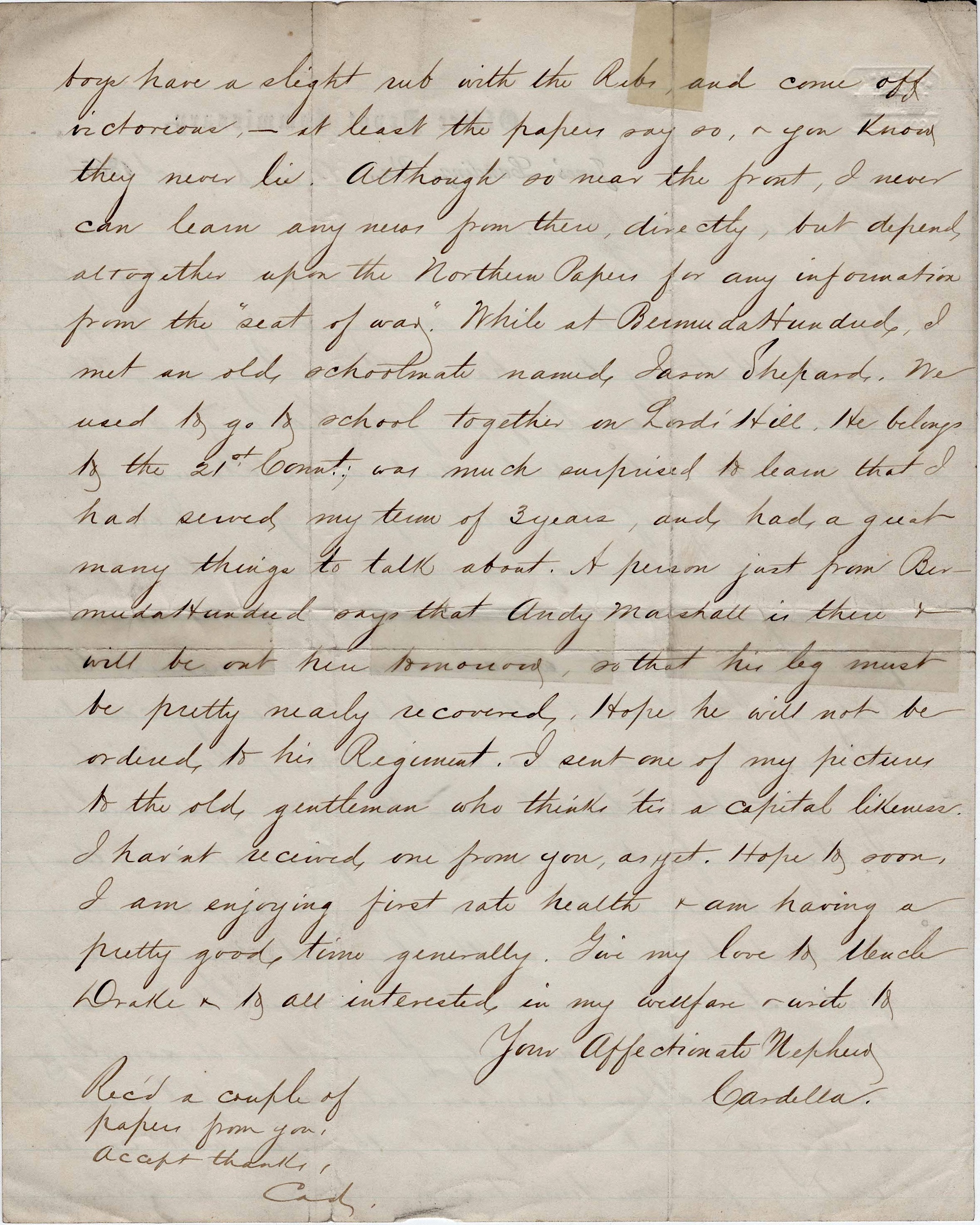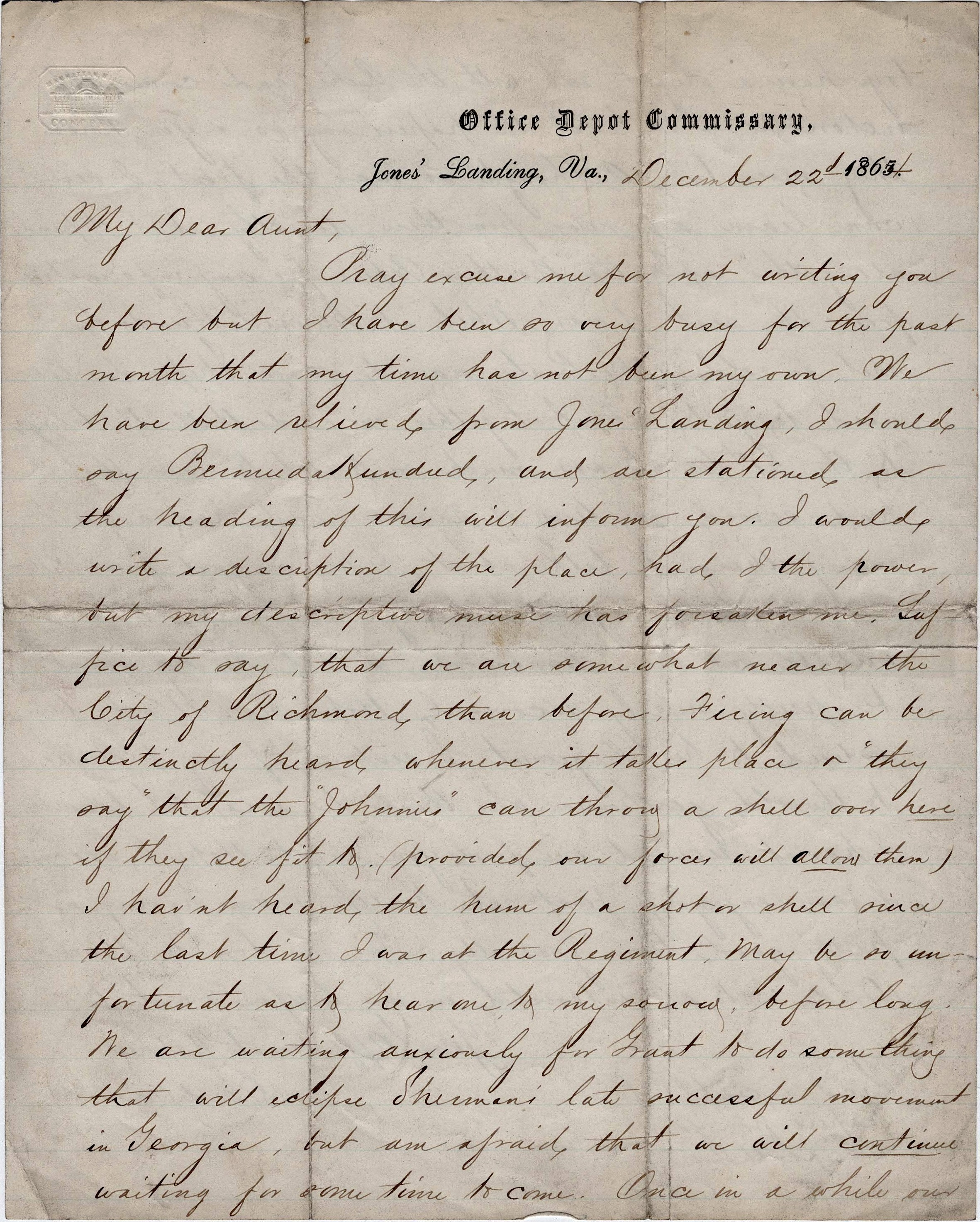 Pray excuse me for not writing you before but I have been so very busy for the last month that my time has not been my own. We have been relieved from Jones’ Landing—I should say Bermuda Hundred—and are stationed as the heading of this will inform you. I would write a desription of the place had I the power but my descriptive muse has forsaken me. Suffice to say that we are somewhat nearer the City of Richmond than before. Firing can be distinctly heard whenever it takes place & “they say” that the “Johnnies” can throw a shell over here if they see fit to (provided our forces will allow them). I haven’t heard the hum of a shot or shell since the last time I was at the Regiment. May be so unfortunate as to hear one to my sorrow before long.