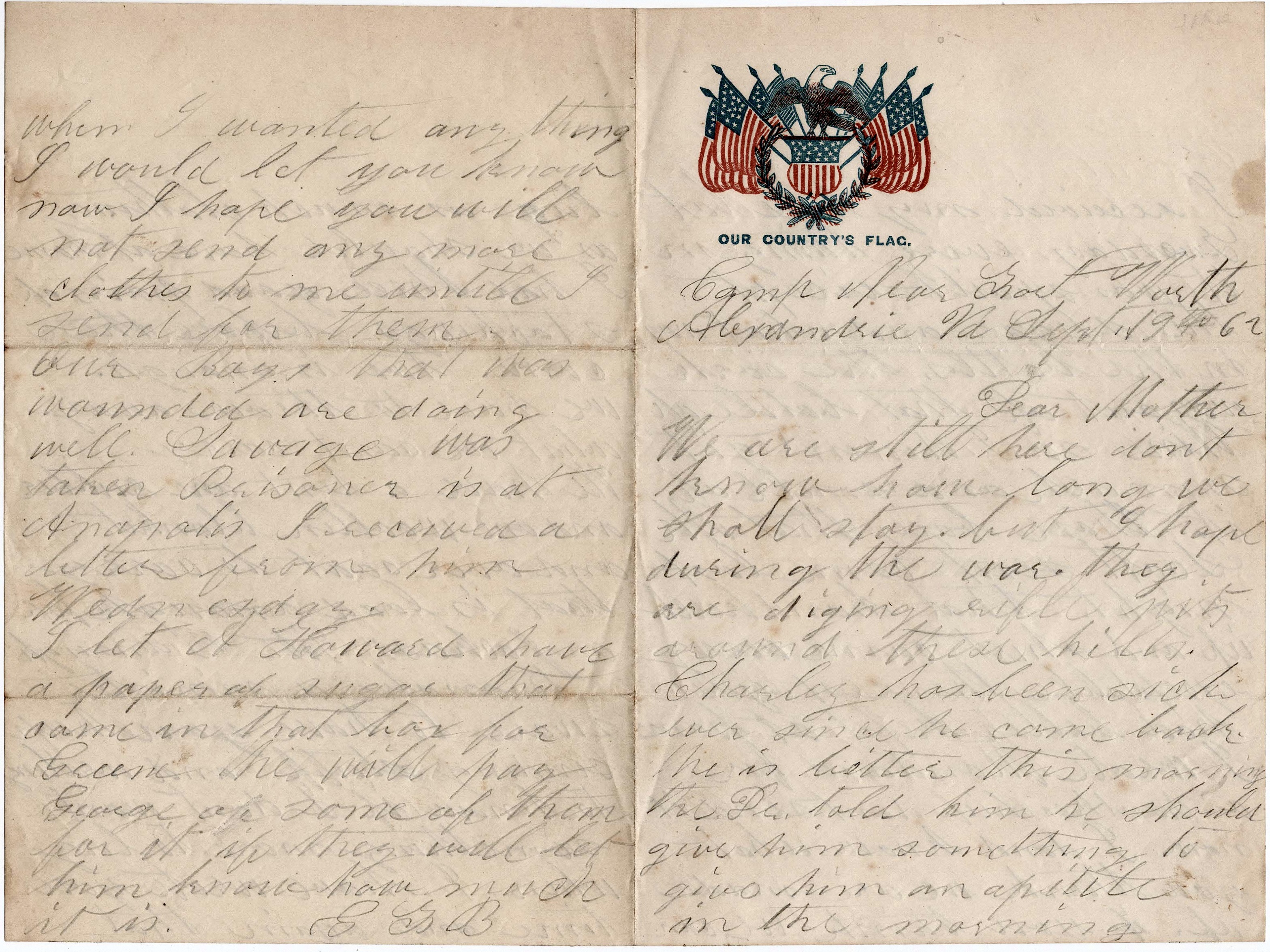Our boys that was wounded are doing well. Savage was taken prisoner [and[ is at Annapolis. I received a letter from him Wednesday. I let Howard have a paper of sugar that came in that box for Greene. He will pay George off some of them for it if they will let him know how much it is. — G. F. B.