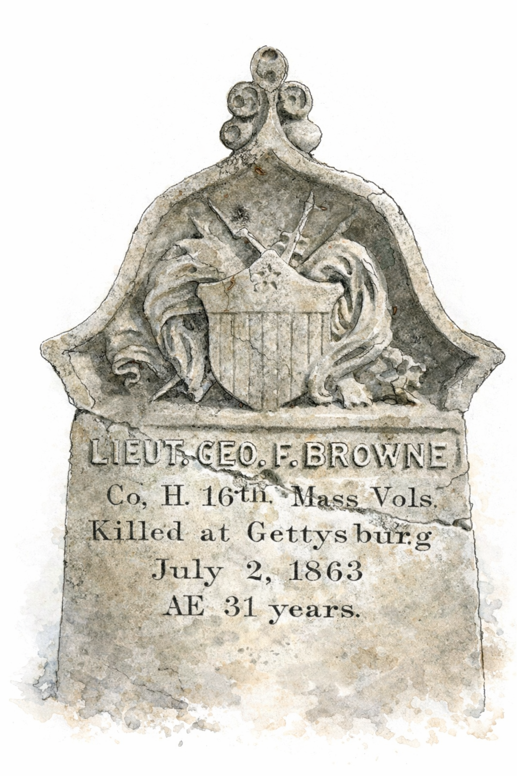 The Massachusetts brothers, George and Charles Brown, were both mortally wounded at Gettysburg, July 2, 1863. “On July 21, 1863, residents of the town of Waltham, Massachusetts gathered at the First Methodist Society to comfort a widowed mother of two local young men who had perished on a distant battlefield in Pennsylvania. It was an impressive and touching service, conducted by members of the Masonic order, augmented by a solemn organ and choir. George F. Brown had enlisted at the same time with his brother, and was also mustered into Company H, but at the rank of sergeant. It was something of a miracle that the body of Lieutenant George F. Brown had been found. Lieutenant George F. Brown of Company B, had been shot through the brain and foot. Charles found himself posted at the Daniel Klingle place on the Emmitsburg road. It was nearly 7 p.m. on July 2, 1863 and the enemy was closing in from two directions at once, the 18th Mississippi approaching from the south, and the 10th and 11th Alabama from the west. In the merciless crossfire Charles was struck in the shoulder and in two other unspecified spots. While Mr. Greene was busy making arrangements for the recovery of George’s body, Charles unexpectedly took a sudden turn for the worse. He succumbed on the morning of July 11. Now Mr. Greene stayed on to ensure both men were embalmed and transported to Waltham, where they could be properly honored and mourned. Both local heroes had rendered their “last full measure of devotion” to their country.”