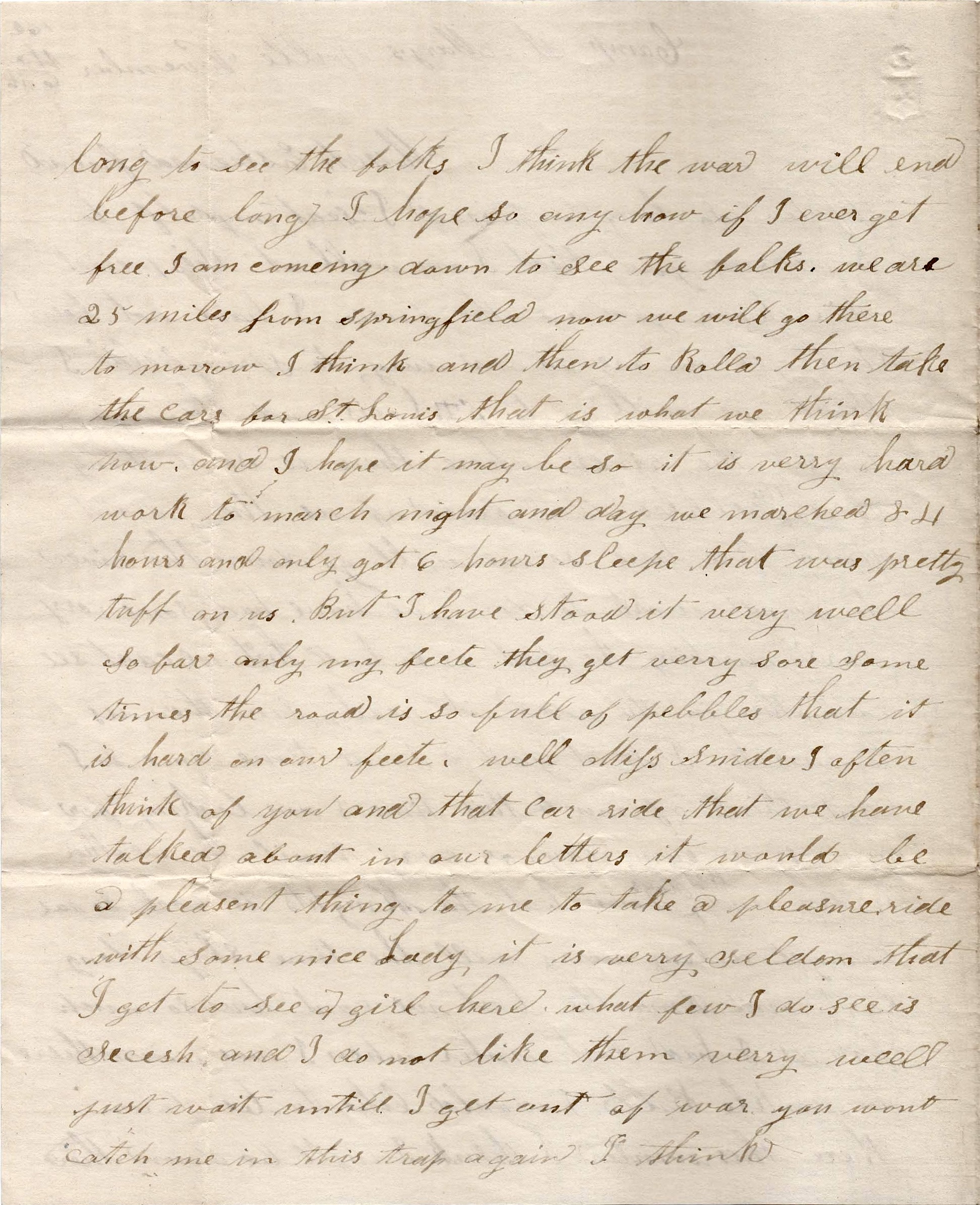 We are 25 miles from Springfield now. We will go there tomorrow, I think, and then to Rolla, then take the cars for St. Louis. That is what we think now and I hope it may be so. It is very hard work to march night and day. We marched 84 hours and only got 6 hours sleep. That was pretty tuff on us. But I have stood it very well so far—only my feet, they get very sore sometimes. The road is so full of pebbles that it is hard on our feet.