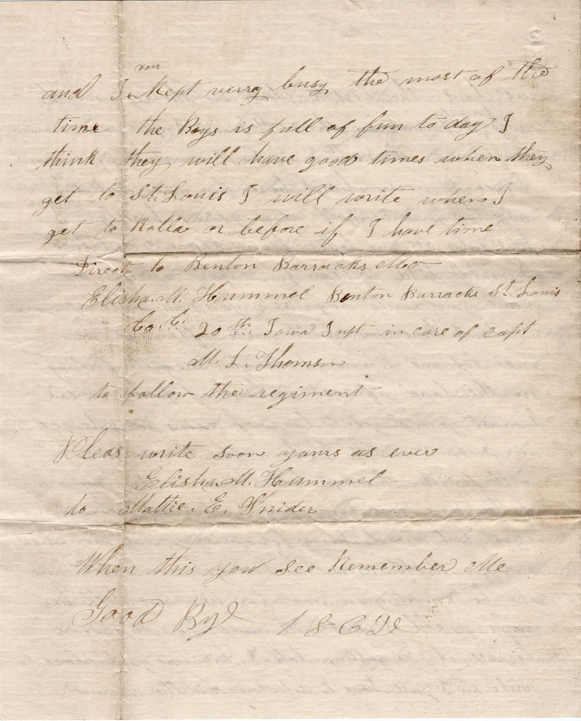The Boys is full of fun today. I think they will have good times when they get to St. Louis. I will write when I get to Rolla or before if I have time. Direct to Benton Barracks, Mo., Elisha M. Hummel, Co. C, 20th Iowa Infantry in care of Capt. M. L. Thomson