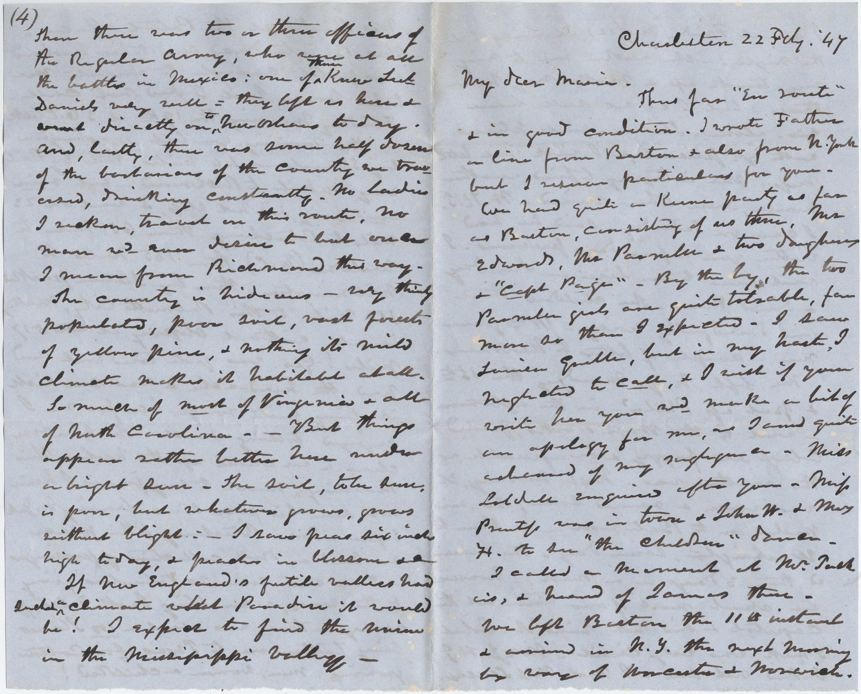 George was quite tired out and had the headache & was sea sick—it being quite rough. As for me, I enjoyed tossing much. The sun rose clear as we came up the harbor this morning, much to my joy as I have not seen his face since leaving New York before. From Petersburg to this place we had a droll collection of passengers. There was so 20 volunteers going to the wars resembling Jack Falstaff’s army. There was about 100 slaves being taken on to Texas for cotton growing—men, women and children! Then there was two or three officers of the Regular Army who were at all the battles in Mexico, one of them knew Lt. Daniels very well. They left us here and went directly on to New Orleans today. And lastly, there was some half dozen of the barbarians of the country we traversed, drinking constantly. No ladies, I reckon, travel on this route. No man would ever desire to but once—I mean from Richmond this way. The country is hideous—very thinly populated, poor soil, vast forests of yellow pine & nothing [about] its mild climate makes it habitable at all— so much of most of Virginia & all of North Carolina. But things appear rather better here under a bright sun. The soil, to be sure, is poor, but whatever grows, grows without blight. I saw peas six inches high today & peaches in blossom &c. If New England’s fertile valleys had such a climate, what paradise it would be! I expect to find the union in the Mississippi Valley. We shall go hence after resting here a few days.