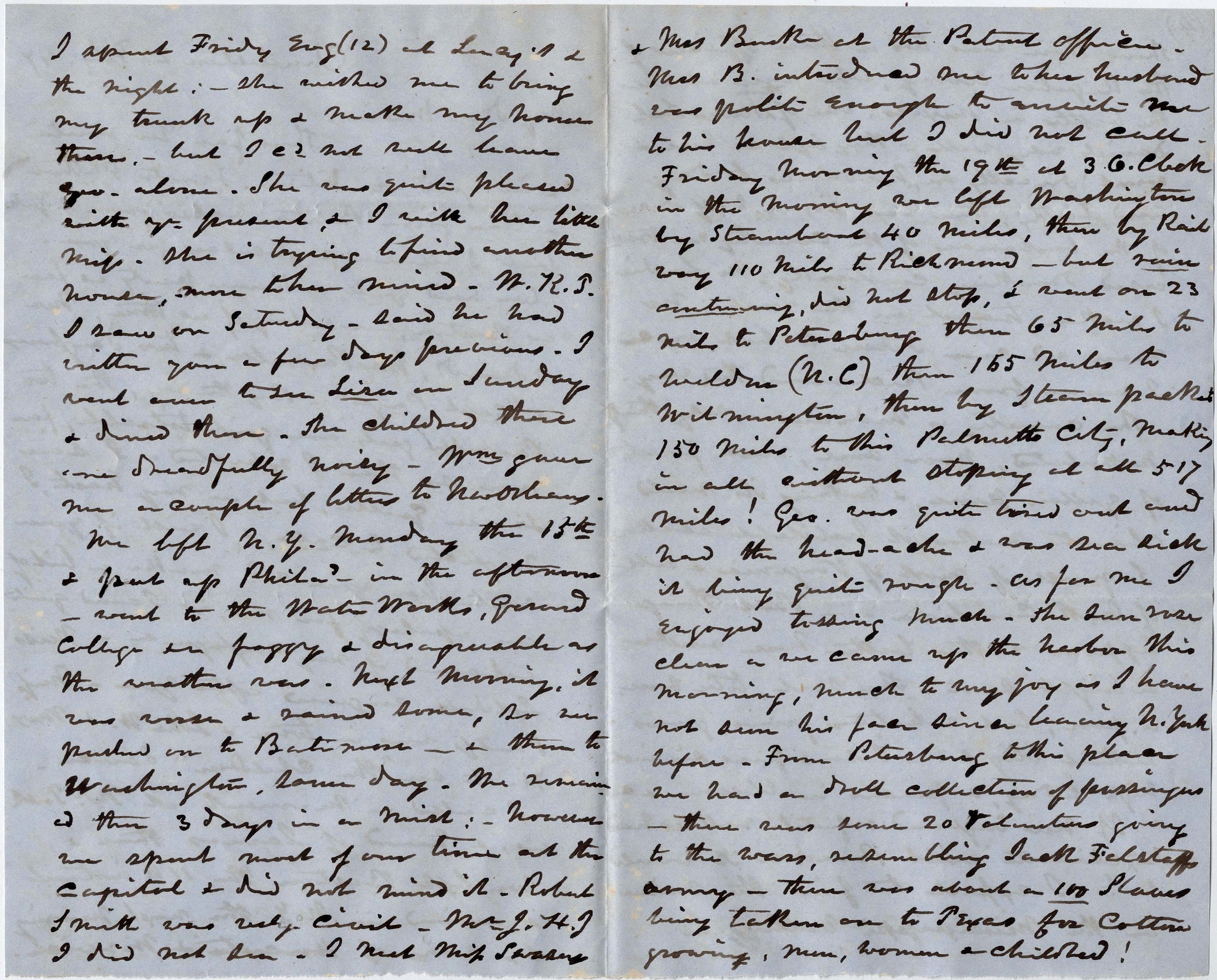 Friday morning the 19th at 3 o’clock in the morning we left Washington by steamboat 40 miles, then by railway 110 miles to Richmond, but rain continuing, did not stop, & went on 23 miles to Petersburg, then 65 miles to Weldon (N. C.), then 155 miles to Wilmington, then by steam packet 150 miles to this Palmetto City, making in all without stopping at all 517 miles!