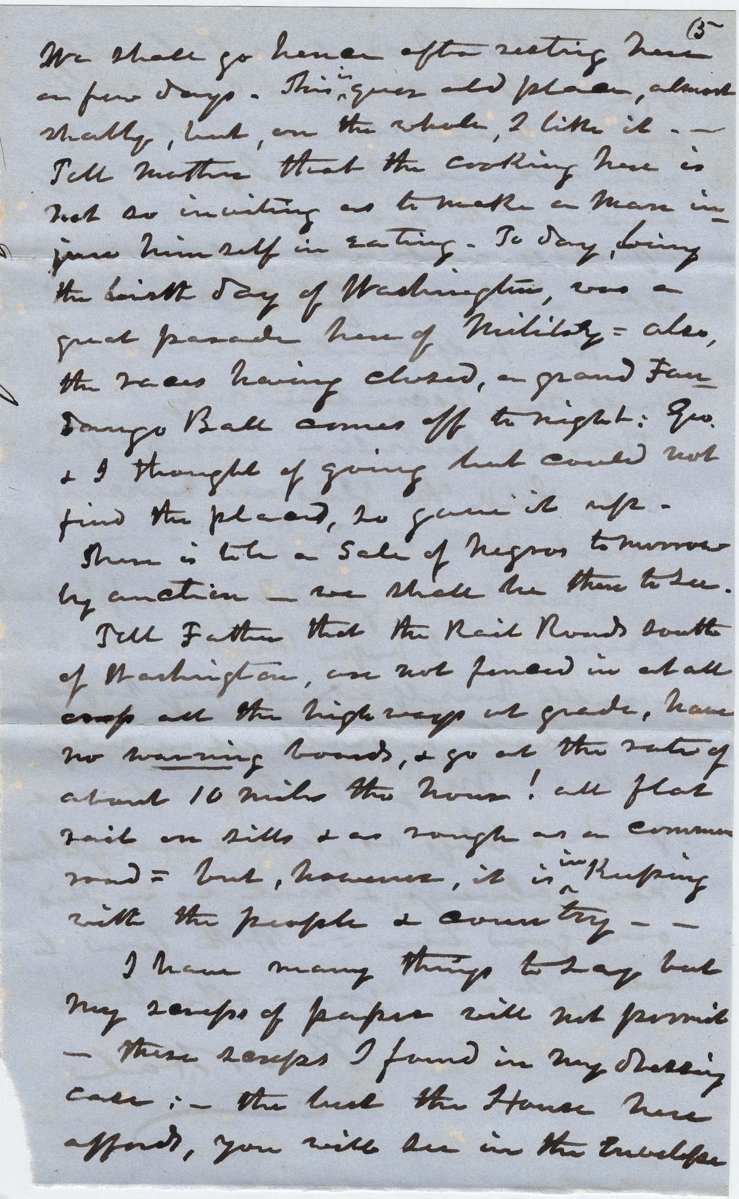 Tell Father that the Railroads south of Washington are not fenced in at all, cross all the highways at grade, have no warning boards, & go at the rate of about ten miles the hour! all flat rail on hills & as rough as a common road, but, however, it is in keeping with the people & country.