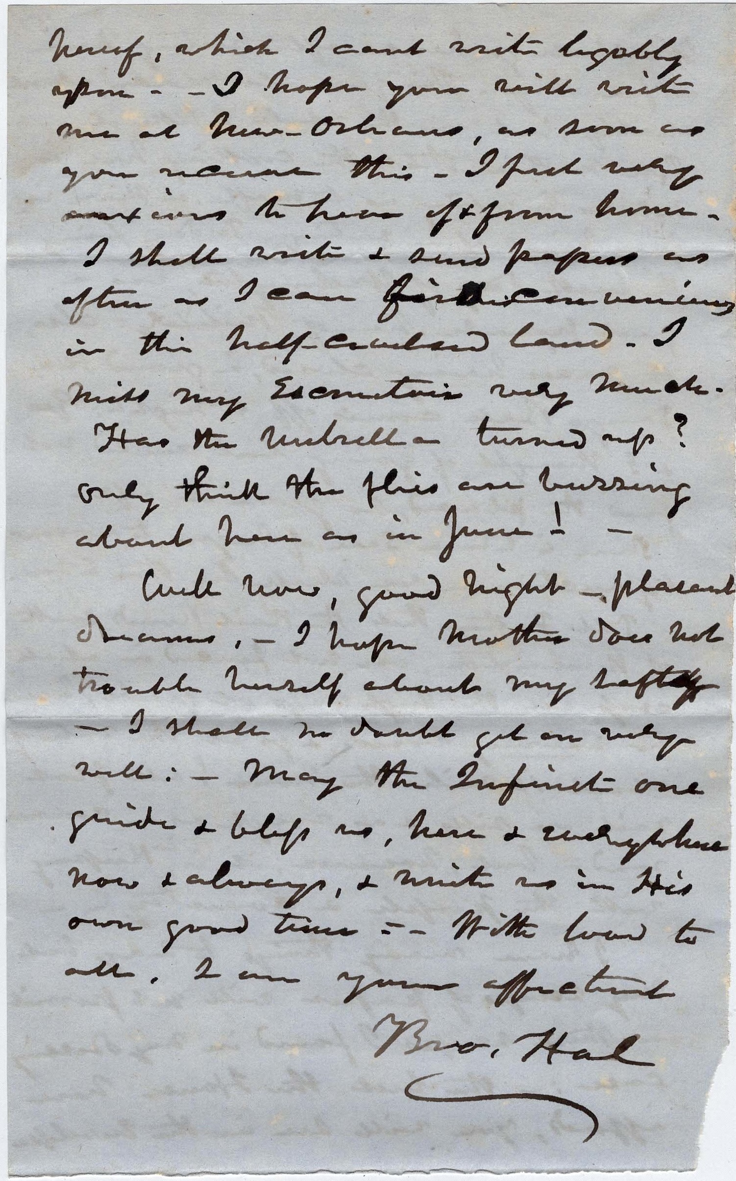 I have many things to say but my scraps of paper will not permit. These scraps I found in my dressing case—the best the House here affords. You will see in the envelope hereof which I can’t write legibly upon. I hope you will write me at New Orleans as soon as you receive this. I feel very anxious to hear of and from home. I shall write and send papers as often as I can for convenience in this half-civilized land. I miss my Esc____ very much. Has the umbrella turned up? Only think—the flies are buzzing about here as in June!
