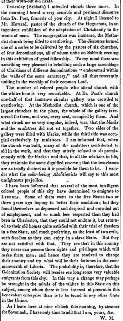 While researching this letter, I found this letter posted in the Daily National Intelligencer on 24 February 1847 describing a visit to Charleston, South Carolina, at approximately the same time as Elliot’s visit.