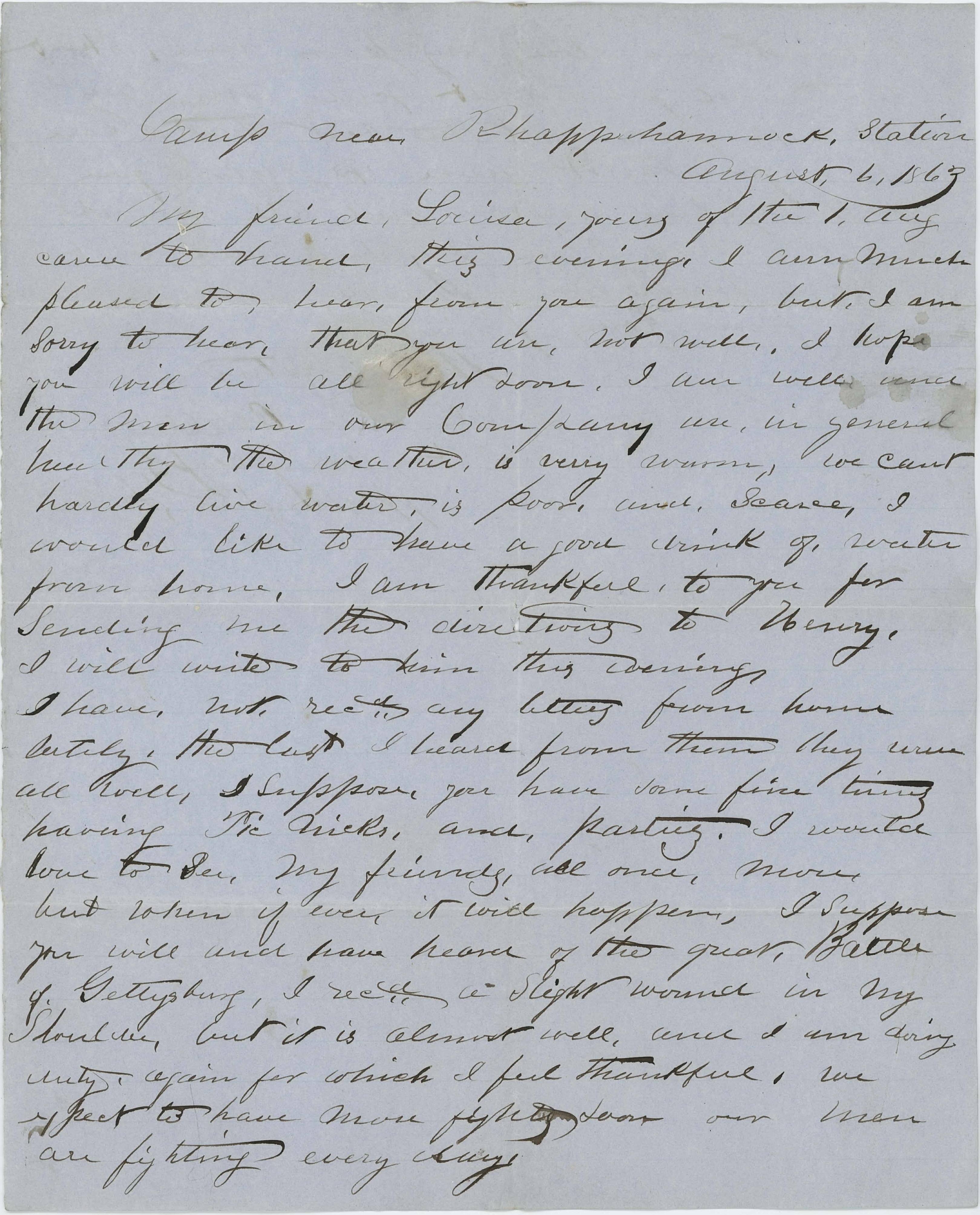 I suppose you will and have heard of the great Battle of Gettysburg. I received a slight wound in my shoulder but it is almost well and I am doing duty again for which I feel thankful. We expect to have more fights soon. Our men are fighting every day.