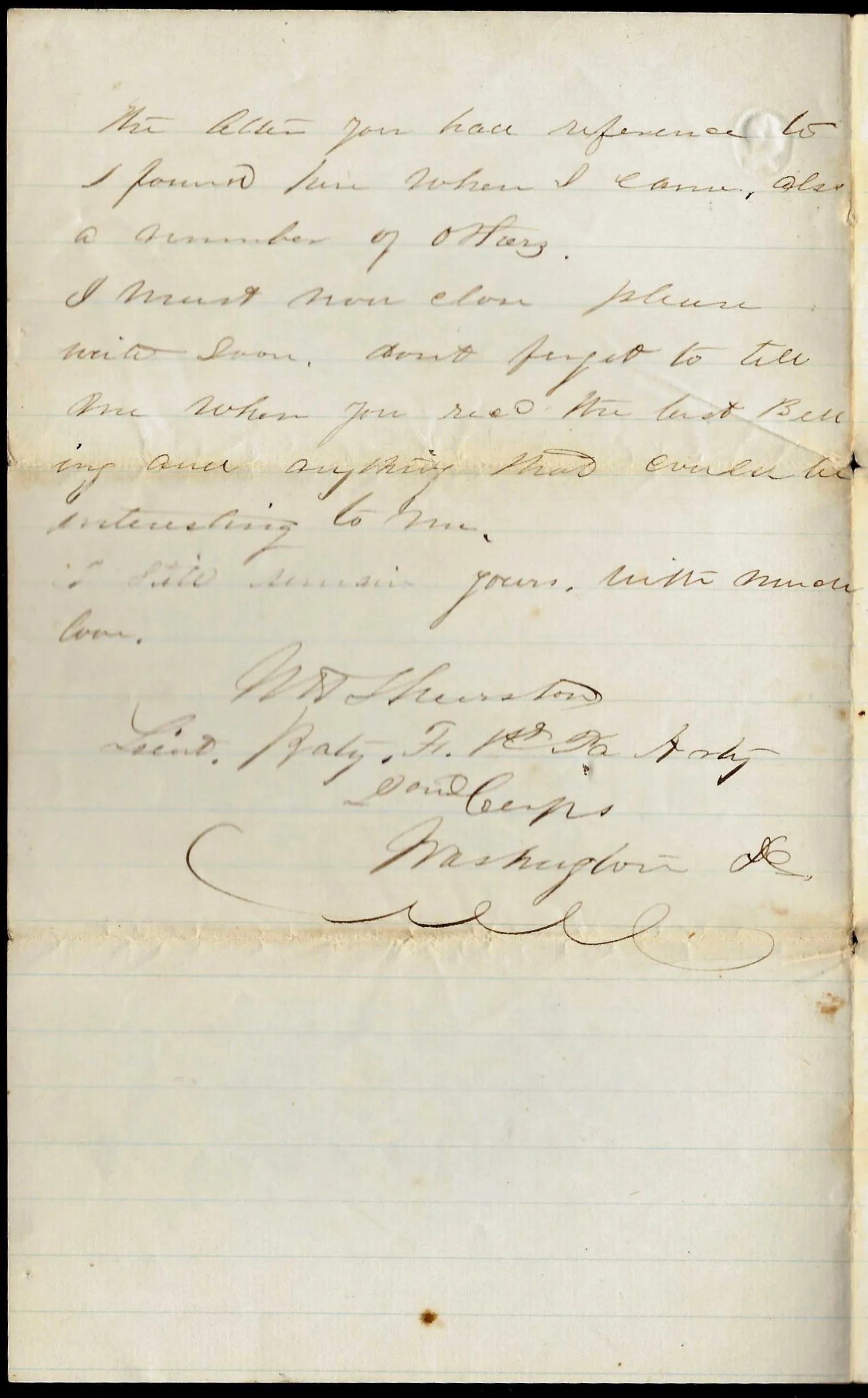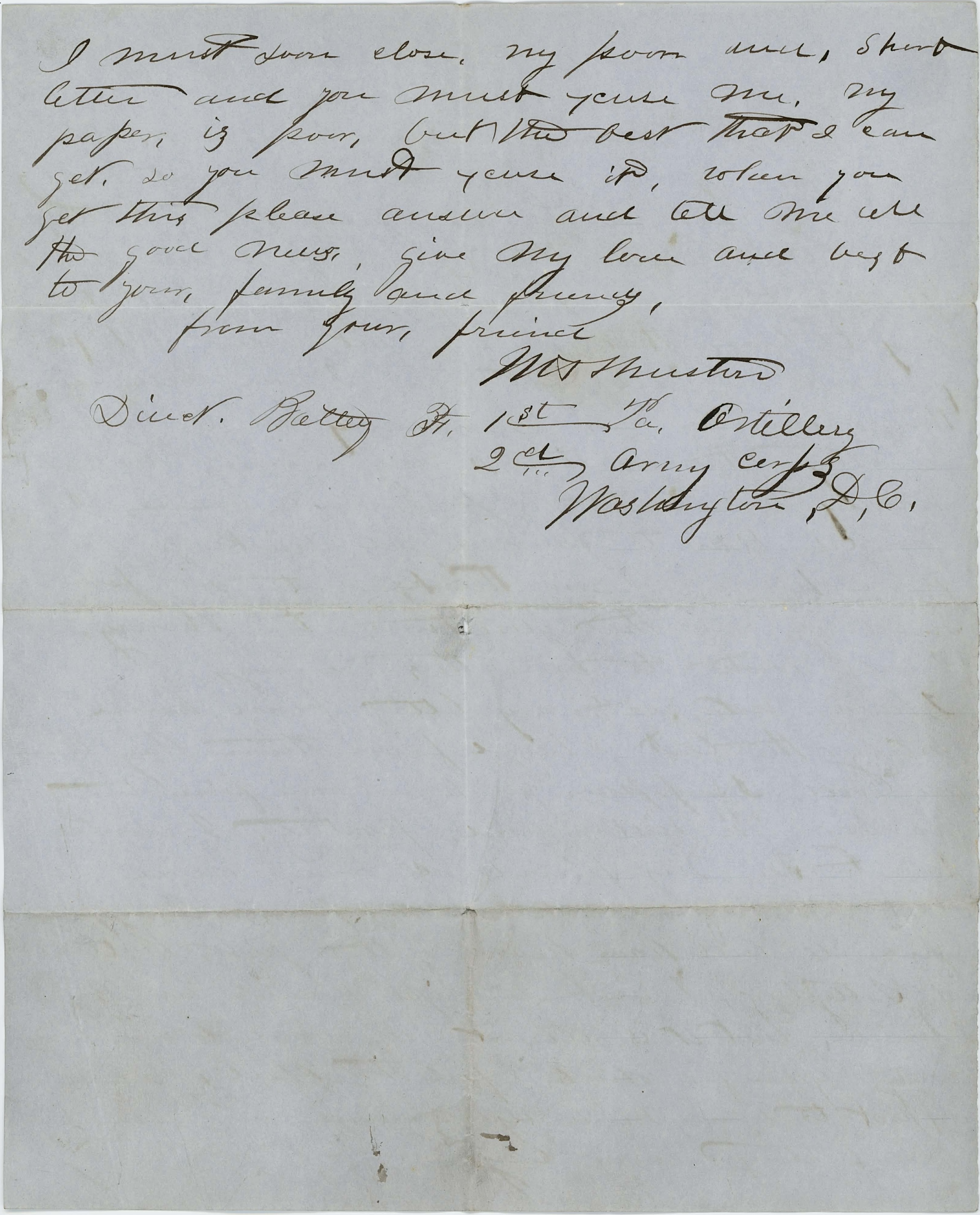 I must soon close my poor and short letter and you must excuse me. My paper is poor but the best that I can get so you must excuse it. When you get this, please answer and tell me all the good news. Give my love and best to your family and friends. From your friend, — W. H. Thurston
