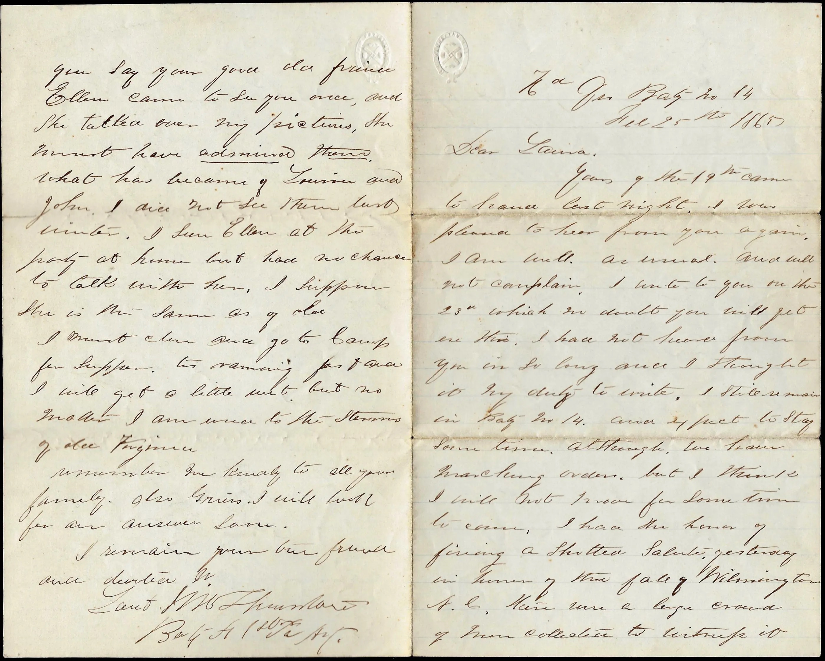 I had the honor of firing a shotted salute yesterday in honor of the fall of Wilmington, North Carolina. There were a large crowd of men collected to witness it. I had no accident and it went all well and good. The Army seems to be in good cheer and I think the next fight we make will be a telling blow to the Rebs. We will have some hard fights but I think ’tis safe to say the end is drawing nigh. The Rebels are deserting by hundreds which must soon deplete their ranks. They are without a doubt hungry and tired of fighting. They are also ragged and dirty with forlorn looks and are objects of pity.