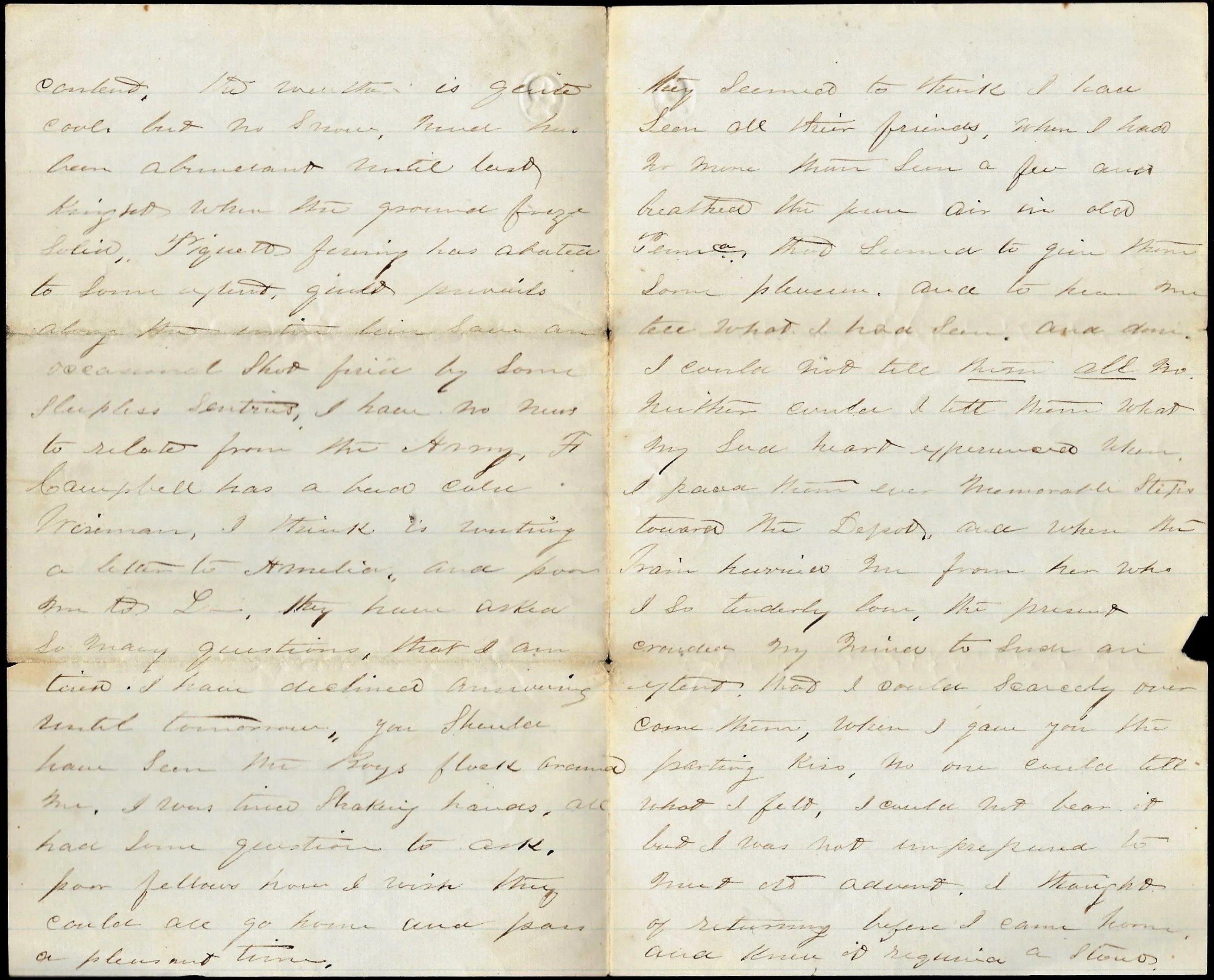 I have no news to relate from the Army. [John] F. Campbell has a bad cold. [Henry] Wireman, I think, is writing a letter to Amelia, and poor W. to L. They have asked so many questions that I am tired. I have declined answering until tomorrow. You should have seen the boys flock around me. I was tired shaking hands. All had questions to ask. Poor fellows — how I wish they could all go home and pass a pleasant time. They seemed to think I had seen all their friends when I had no more than seen a few and breathed the pure air in Old Pennsylvania. That seemed to give them some pleasure and to hear me tell what I had seen and done. I could not tell them all. No neither could I tell them what my sad heart experienced when I paced them ever memorable steps toward the depot and when the train hurried me from her who I so tenderly love. The present crowded my mind to such an extent that I could scarcely overcome them when I gave you the parting kiss. No one could tell what I felt. I could not bear it but I was not unprepared to meet its advent. I thought of returning before I came home and knew it required a stout heart and strong mind under circumstances to overcome it. But I am back again and must think of something else part of the time.