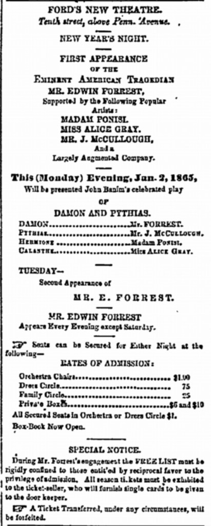 Ad in the Daily National Inteligencer for Ford Theatre on Monday, 2 January 1865: Damon & Pythias featuring Edwin Forest played.