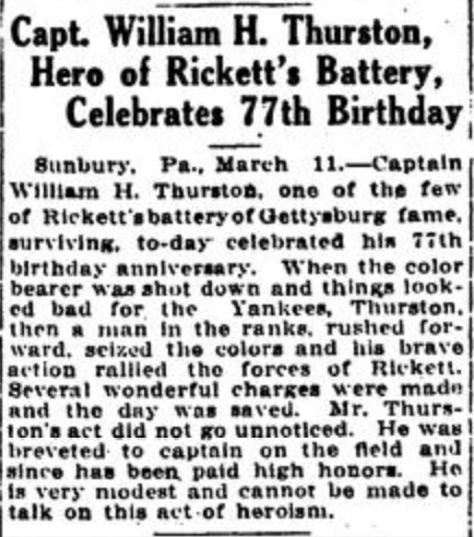At Gettysburg, Capt. Robert B. Ricketts brought 144 men to the field on 2 July 1863 serving six Ordnance Rifles. During the battle they suffered 6 killed, 14 wounded, and three missing. They took a position on Benner’s Hill and at dusk they repulsed a Rebel assault upon the battery in desperate hand-to-hand combat after every round of canister had been fired. The newspaper clipping indicates that Thurston was recognized for his bravery in the action.