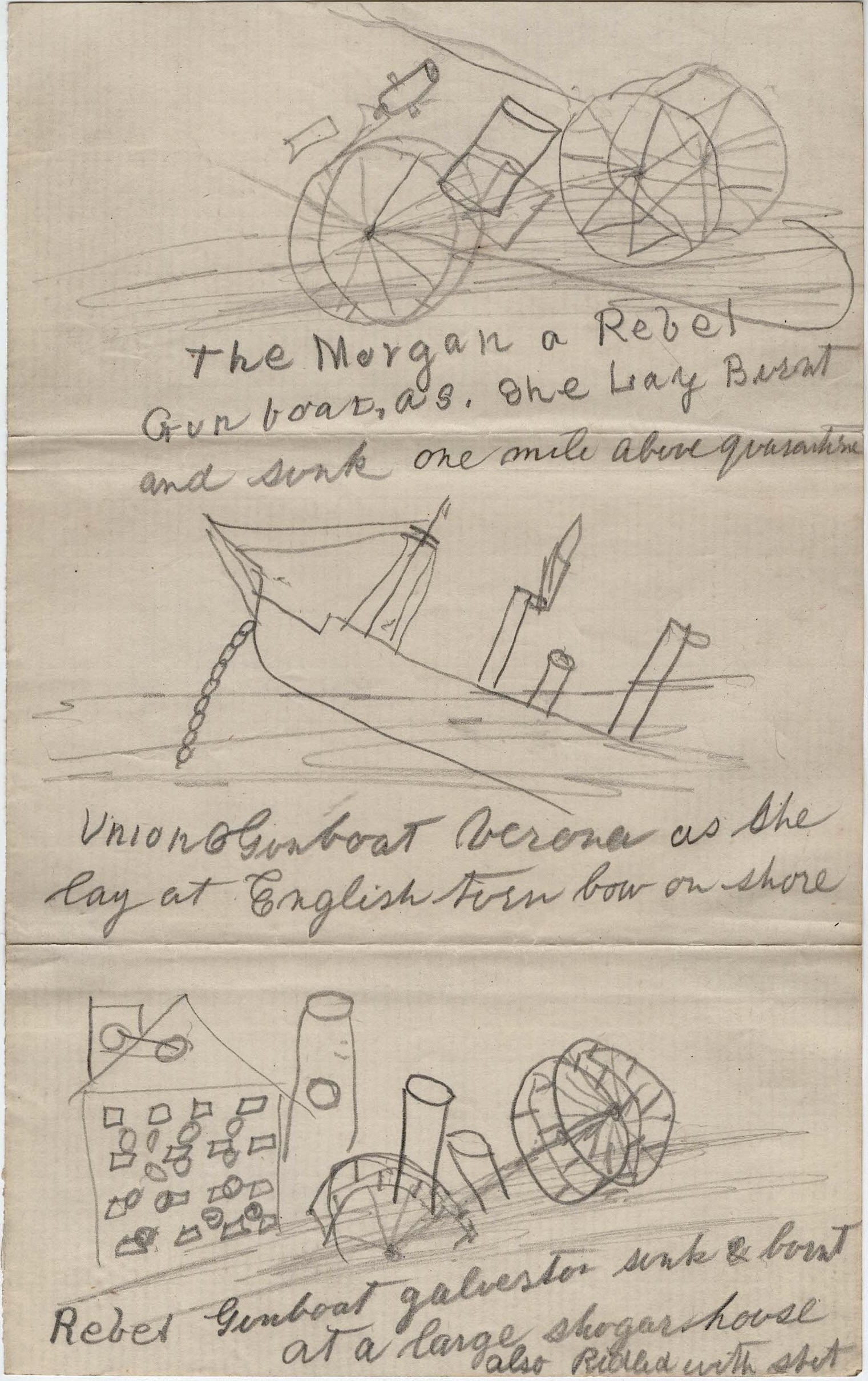 George’s sketches of three shipwrecks: (1) The Morgan—a Rebel Gunboat as she lay burnt and sunk one mile above quarantine [on the Mississippi River]. (2) Union Gunboat Verona as she lay at English turn bow on shore. (3) Revel Gunboat Galveston, sunk and burnt, at a large sugar house also riddled with shot.