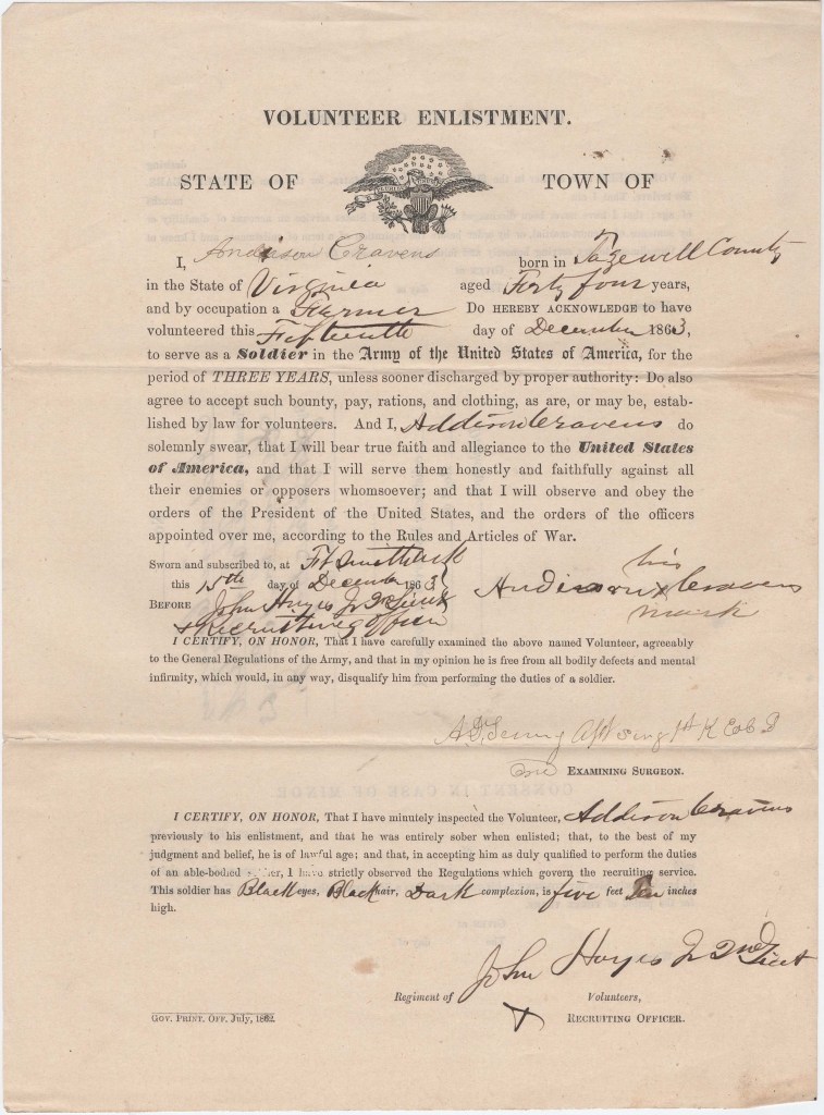An original duplicate (not scan or photocopy) of this same Enlistment record for Addison Cravens can be found in the collections of Virginia Humanities. See Addison Cravens’s Enlistment in the Union army. A description of that record claims that the enlistment form was filled out and signed on Craven’s behalf by “Dr. John Hayes, Jr. who also conducted the medical examination of the recruit.” This is not true. The form was filled out by the recruiting officer, 2nd Lt. John Hayes, Jr. and the medical examination was performed by Abijah D. Tenny, Asst. Surgeon, 1st Kansas Colored Infantry. Addison Craven’s signature was written for him and validated by his mark, “X.” When he enlisted in 1863 at the age of 44, Addison was described as a 5′ 10″ farmer of dark complexion (census records describe him variously as black or mulatto).