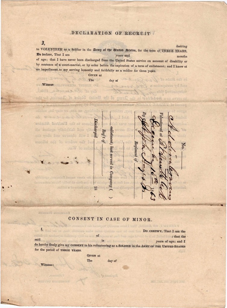 This is the Volunteer Enlistment record for Addison Cravens (1817-1892), born a slave in Tazewell county, Virginia, who joined the 11th US Colored Troops (USCT) on 15 December 1863 at Fort Smith, Arkansas. The regiment was organized in that month and subsequently attached to the 2nd Brigade, District of the Frontier as part of the 7th Corps, Department of Arkansas. It remained a part of the corps until April 1865.