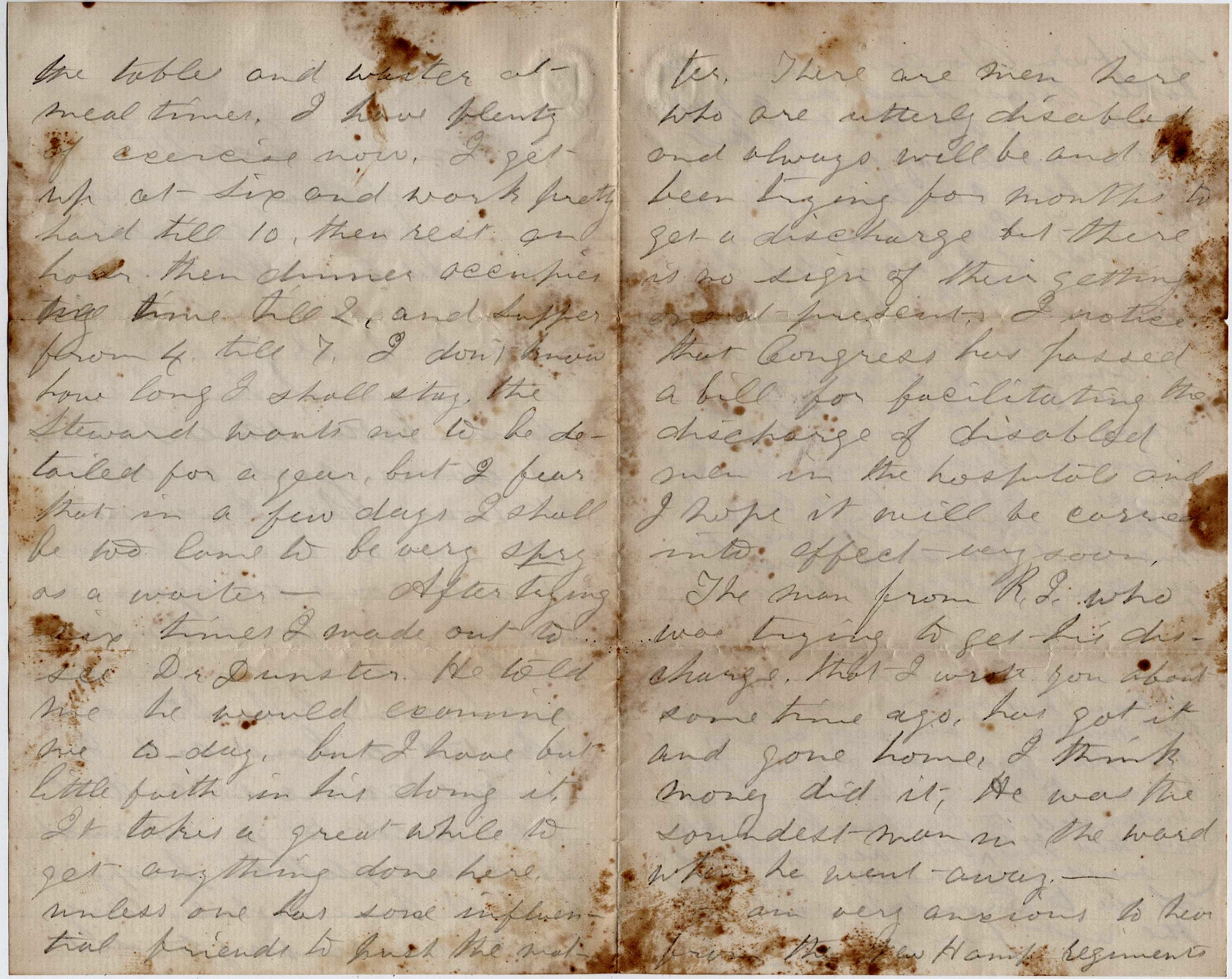 The man from Rhode Island who was trying to get his discharge that I wrote you about some time ago has got it and gone home. I think money did it. He was the soundest man in the ward when he went away.