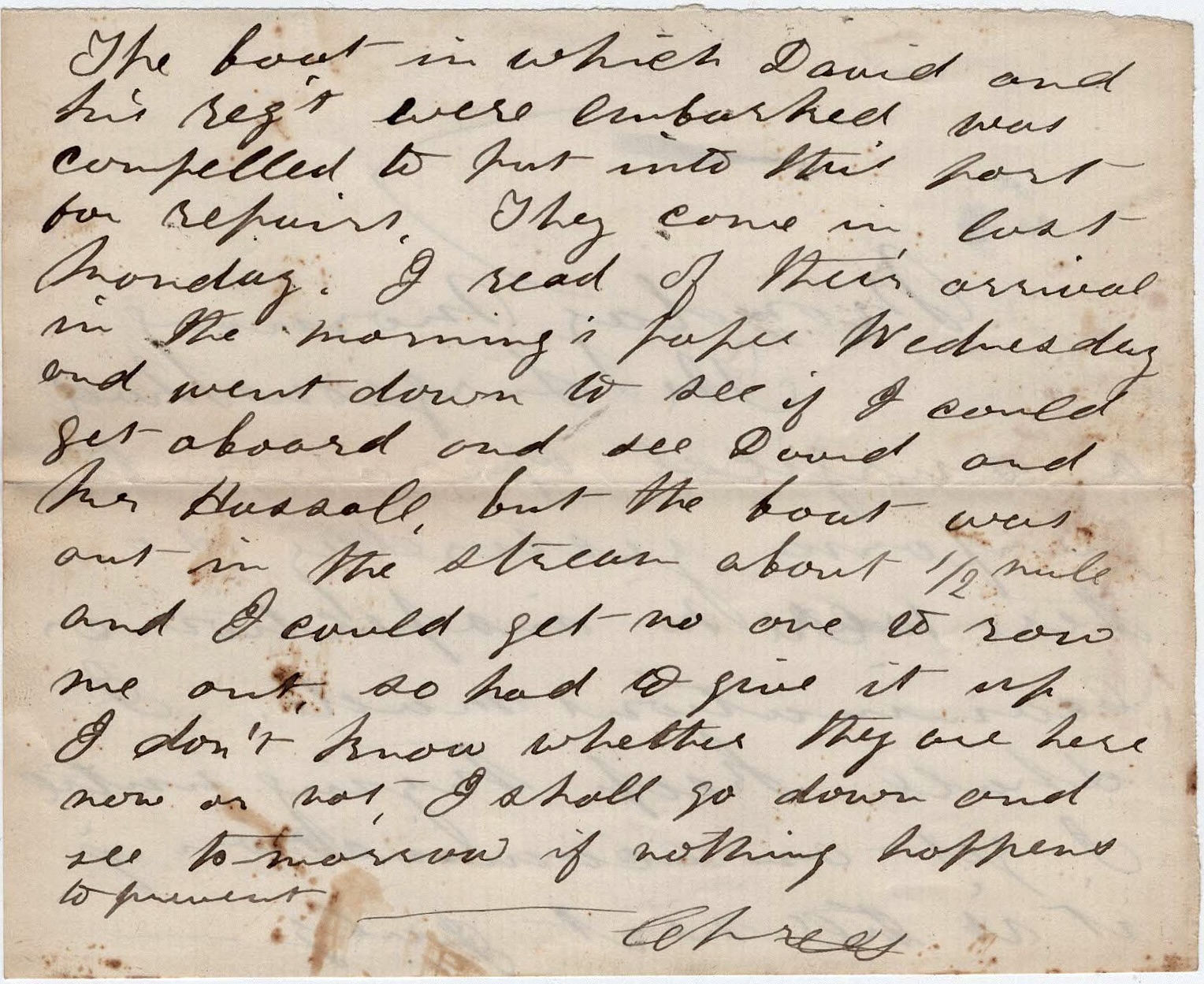 The boat is which David and his regiment were embarked was compelled to put into this fort for repairs. They came in last Monday. I read of their arrival in the morning’s paper Wednesday and went down to see if I could get aboard and see David and Mr. Hussall, but the boat was out in the stream about half a mile and I could get no one to row me out so I had to give it up. I don’t know whether they are here now or not. I shall go down and see tomorrow if nothing happens to prevent. — Charles