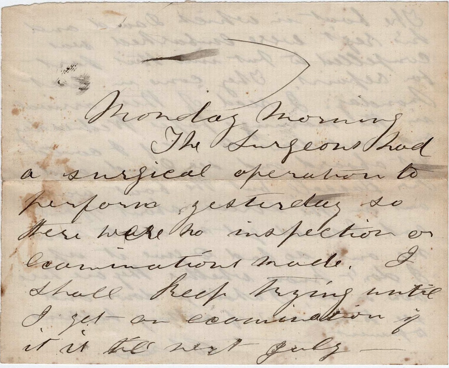 Monday morning. The surgeons had a surgical operation to perform yesterday so there were no inspection or examinations made. I shall keep trying until I get an examination of it till next July.