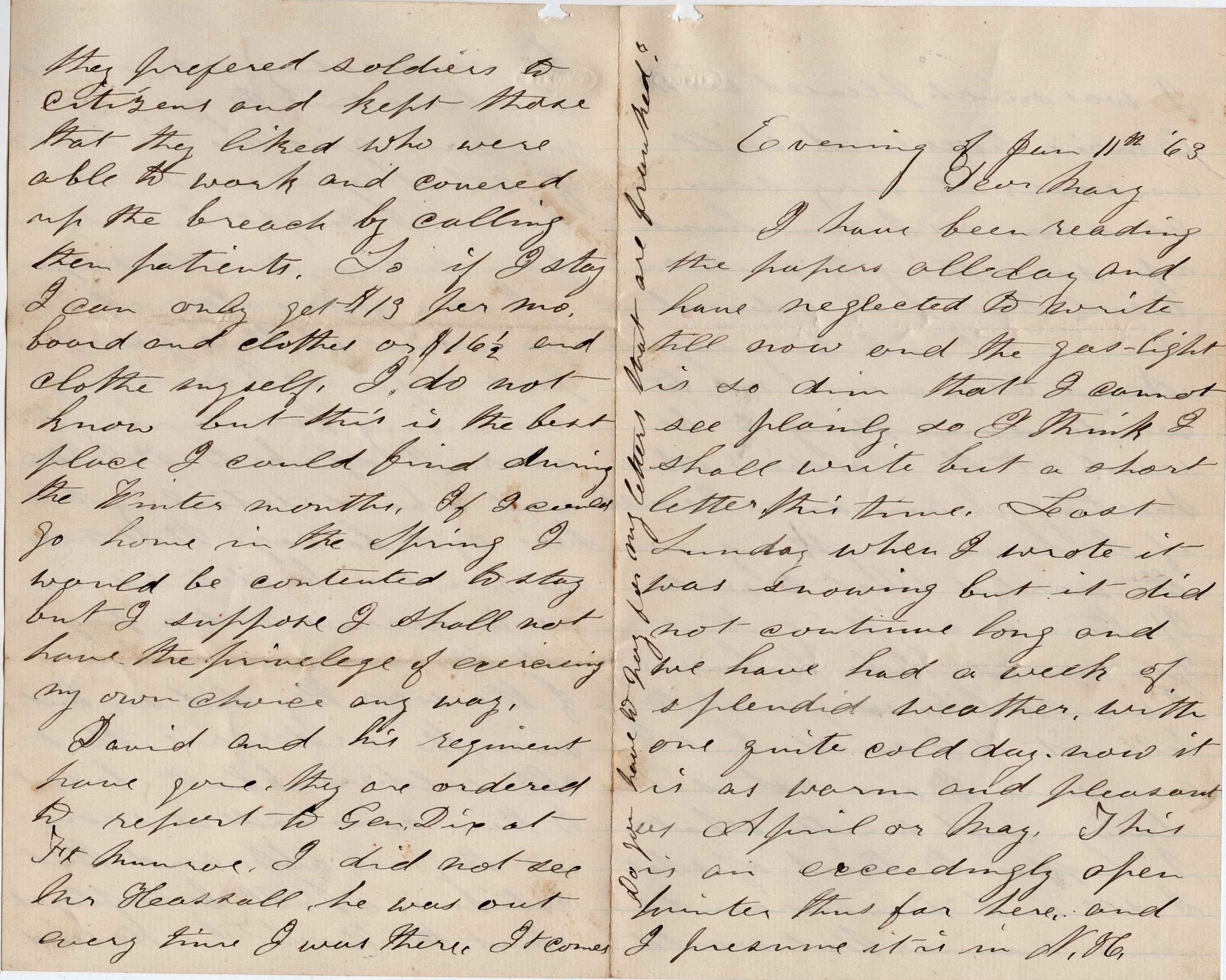 I am getting along about as usual with a fair prospect as far as I can see of remaining here during the war. I spoke to the Steward about detailing me here and he says that now no men can be detailed so as to receive extra pay. At the commencement of the war they did som but now the orders are that all soldiers shall be sent to their commands as soon as they are able and that citizens shall be employed about the hospital. He said they preferred soldiers to citizens and kept those that they liked who were able to work and covered up the breach by calling them patients. So if I stay, I can only get $13 per month, board and clothes, or $16.50 and clothe myself. I do not know but this is the best place I could find during the winter months. If I could go home in the spring, I would be contented to stay but I suppose I shall not have the privilege of exercising my own choice in any way.