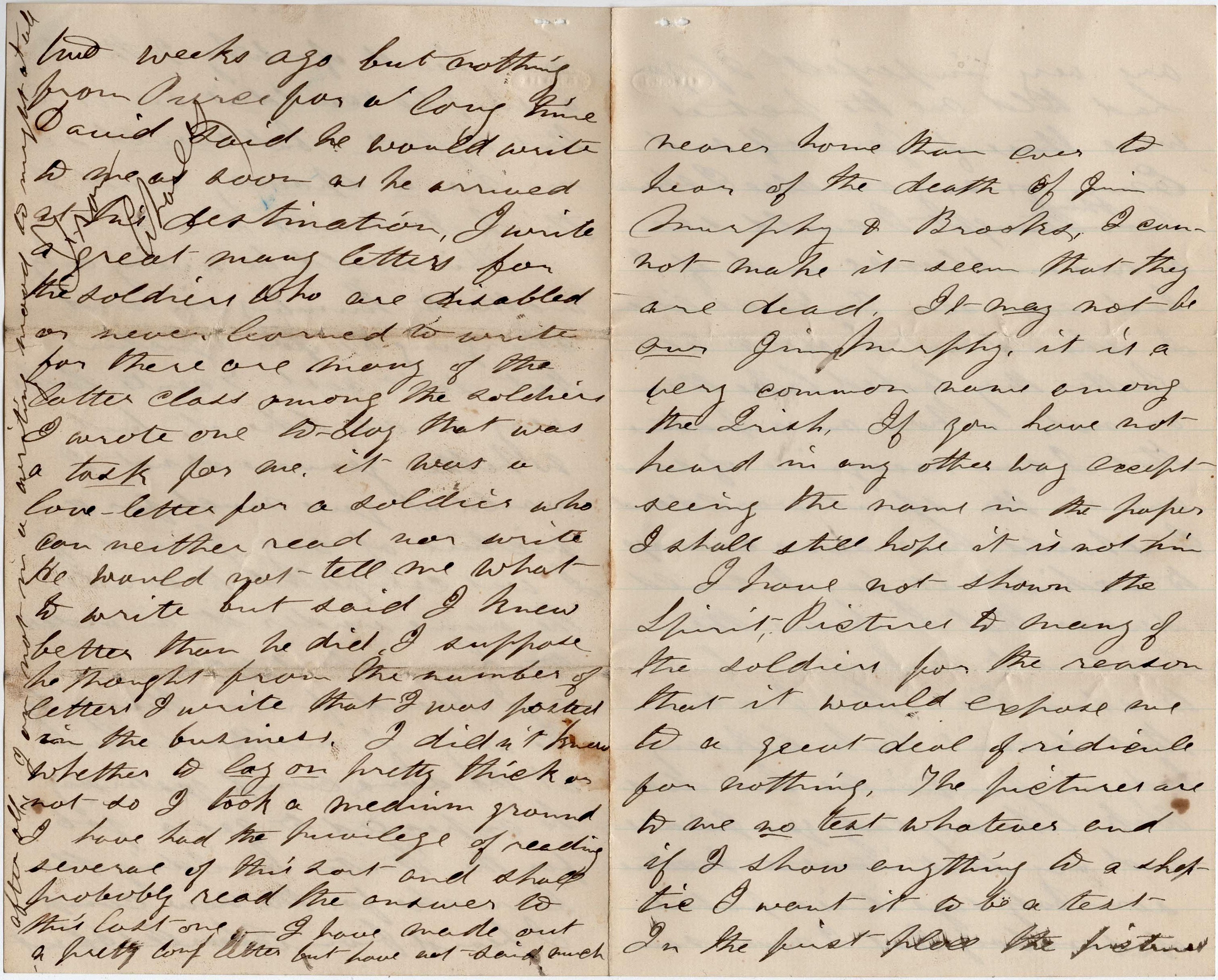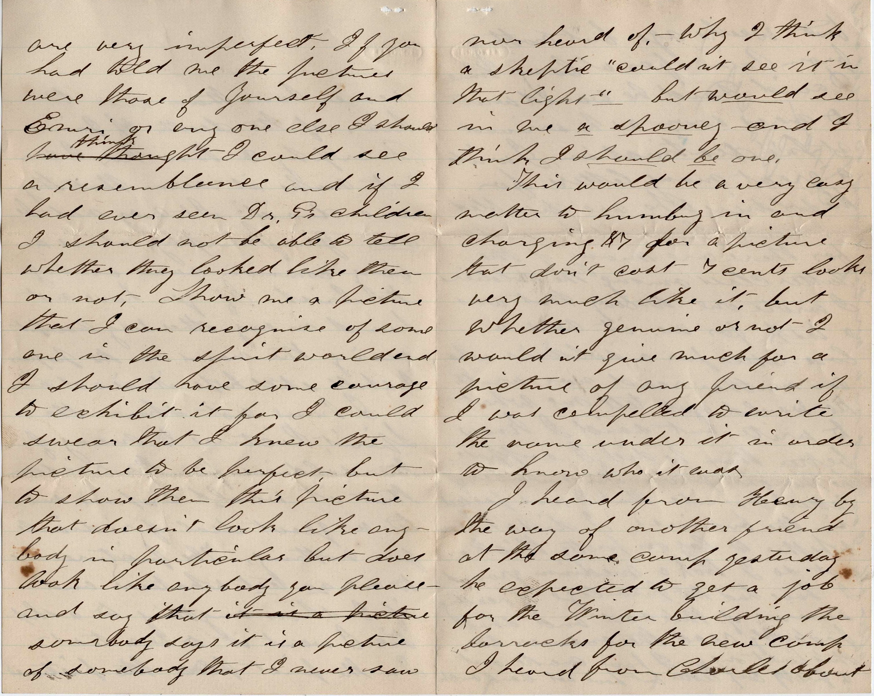 I have not shown the Spirit Pictures to many of the soldiers for the reason that it would expose me to a great deal of ridicule for nothing. The pictures are to me no test whatever and if I show anything to a shot tic [?]. I want is to be a test. In the first place, the pictures are very imperfect. If you had told me the pictures were those of yourself and Emri or anyone else, I should think I could see a resemblance and if I had ever seen Dr. G’s children, I should not be able to tell whether they looked like them or not. Show me a picture that I can recognize of someone in the spirit world and I should have some courage to exhibit it for I could swear that I knew the picture to be perfect, But to show them this picture that doesn’t look like anybody in particular, but does look like anybody you please and say that somebody says it is a picture of somebody that I never saw nor heard of, why I think the skeptic “couldn’t see it in that light.” But would see in me a spooney and I think I should be one.