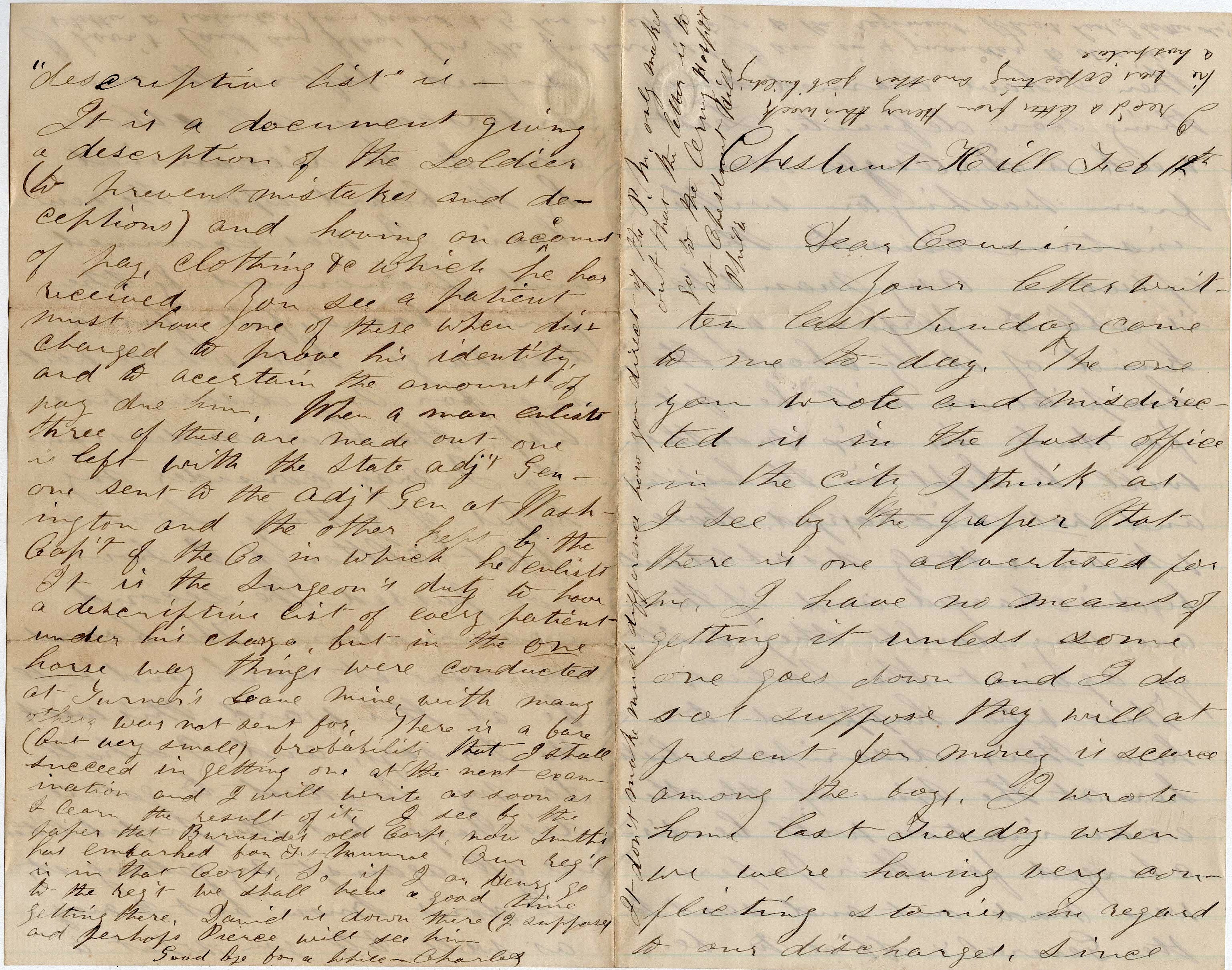 I don’t know but I may as well tell you what a “Descriptive List” is. It is a document giving a description of the soldier (to prevent mistakes and deceptions) and having an account of pay, clothing, &c. which he has received. You see a patient must have one of these when discharged to prove his identity and to ascertain the amount of pay due him. When a man enlists, three of these are made out, One is left with the state Adjutant General, one sent to the Adjutant General at Washington, and the other kept by the Captain of the Company in which he enlists. It is a durgeon’s duty to have a Descriptive List of every patient under his charge, but in the one horse way things were conducted at Turner’s Cave, mine with many others were not sent for. There is a bare (but very small) probability that I shall succeed in getting one at the next examination and I will write as soon as I can the result of it. I see by the paper that Burnside’s old Corps, now Smith’s, has embarked for Ft. Monroe. Our regiment is in that Corps. So if I or Henry go to the regiment, we shall have a good time getting there. David is down there (I suppose) and perhaps Pierce will see him. Goodbye for a while. — Charles