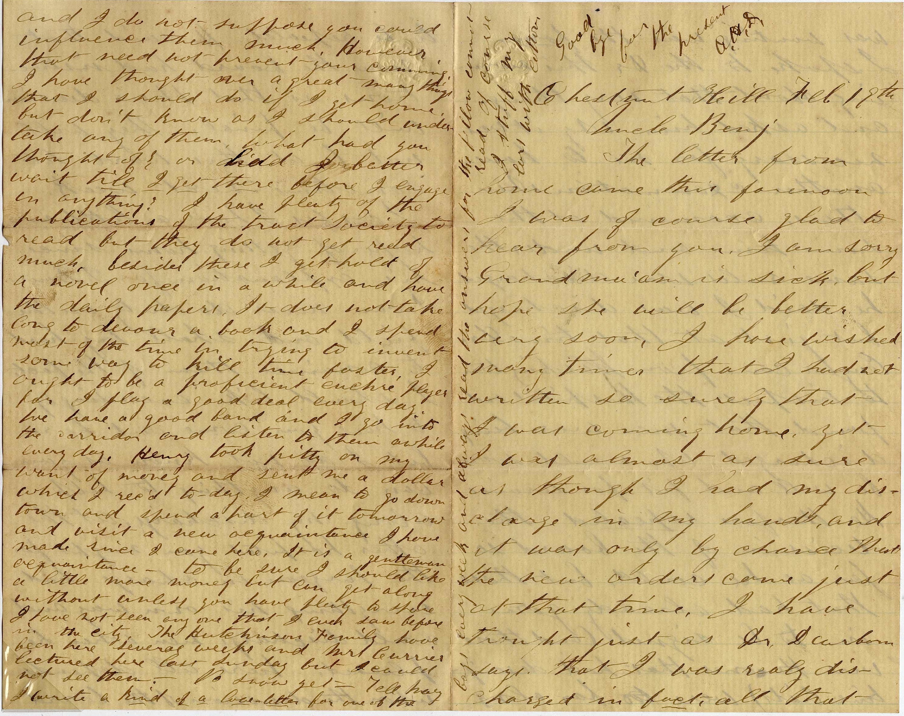 Henry took pity on my want of money and sent me a dollar which I received today. I mean to go down town and spend a part of it tomorrow and visit a new acquaintance I have made since I came here. It is a gentleman acquaintance. To be sure, I should like a little more money but can get along without unless you have plenty to spare. I have not seen anyone that I ever saw before in the city. The Hutchinson Family [Singers] have been here several weeks and Mr. Currier lectured here last Sunday but I could not see them.