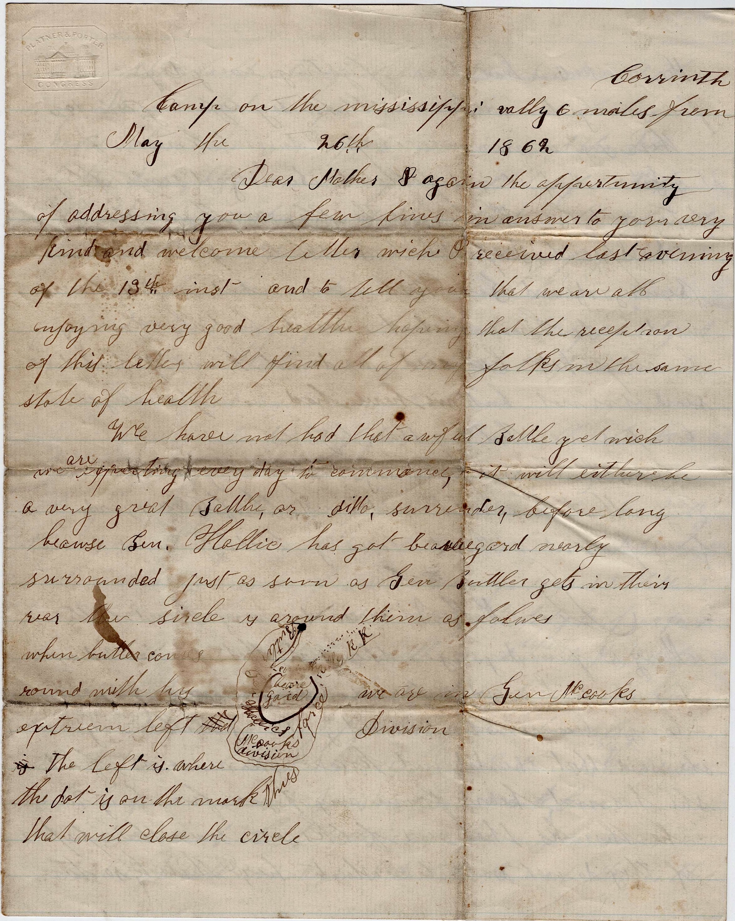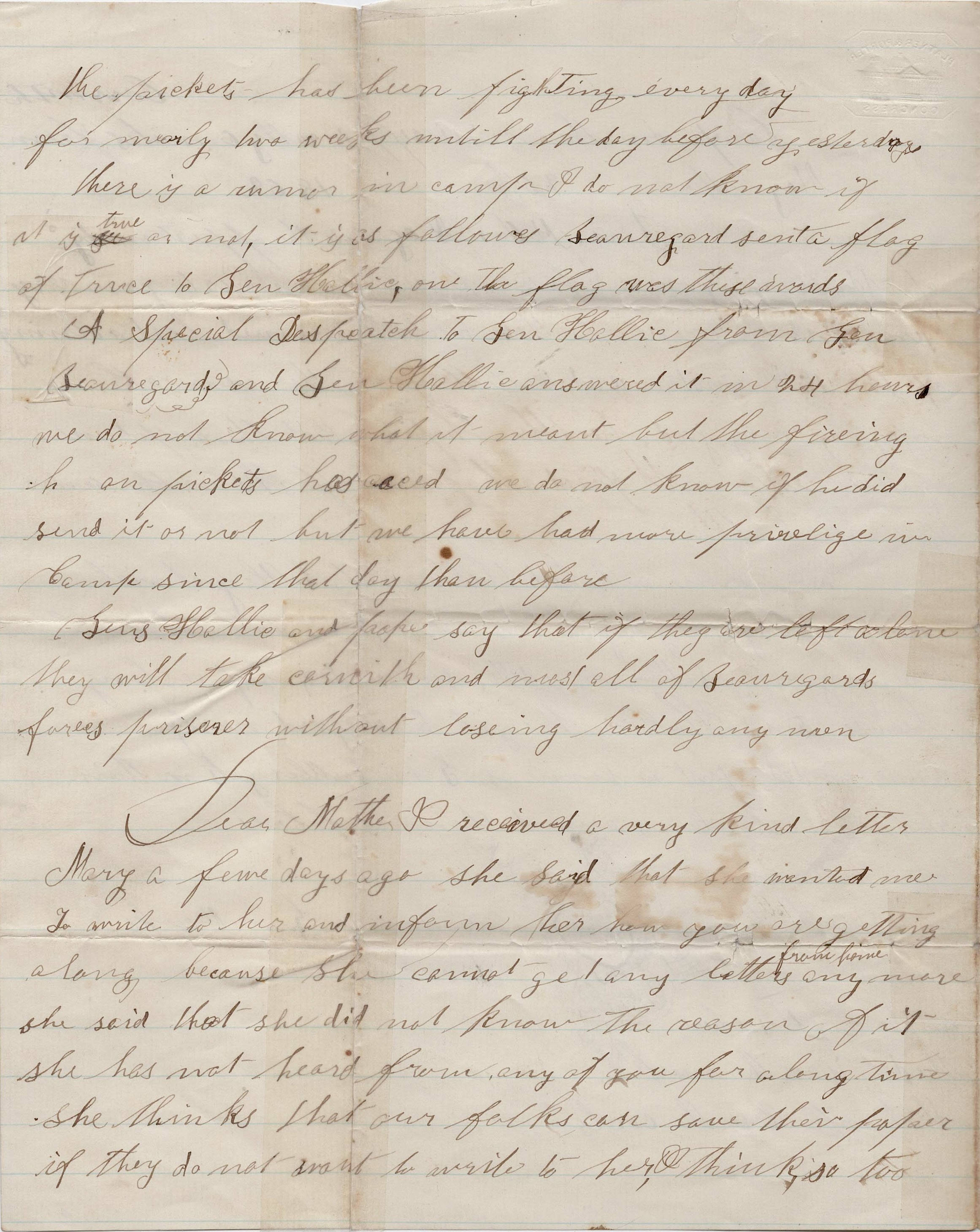 The pickets has been fighting every day for nearly two weeks until the day before yesterday. There is a rumor in camp—I do not know if it is true or not. It is as follows. Beauregard sent a flag-of-truce to Gen. Halleck. On the flag was these words, “A Special Dispatch to Gen. Halleck from Gen. Beauregard,” and Gen. Halleck answered it in 24 hours. We do not know what it meant but the firing on pickets has ceased. We do not know if he did send it or not but we have had more privilege in camp since that day than before.