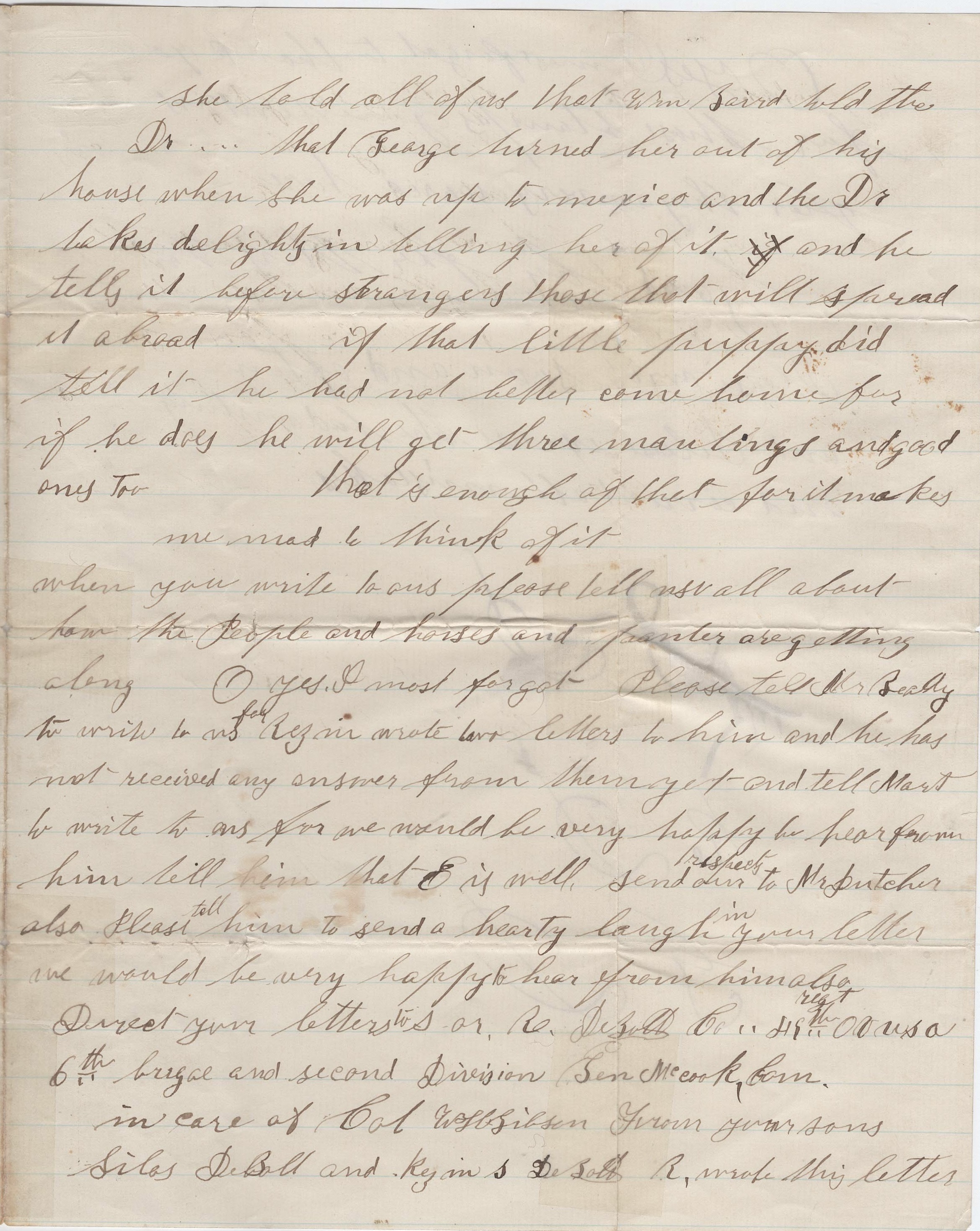 Dear Mother, I received a very kind letter [from] Mary a few days ago. She said that she wanted me to write to her and inform her how you are getting along because she cannot get any letters from home anymore. She said that she did not know the reason of it. She has not heard from any of you for a longtime. She thinks that our folks can save their paper if they do not want to write to her. I think so too. She told all of us that William Baird told the Dr. that George turned her out of his house when she was up to Mexico [Ohio] and the Dr. takes delights in telling her of it and he tells it before strangers—those that wil spread it abroad. If that little puppy did tell it, he had not better come home for if he does, he will get three maulings and good ones too. That is enough of that for it makes me mad to think of it.