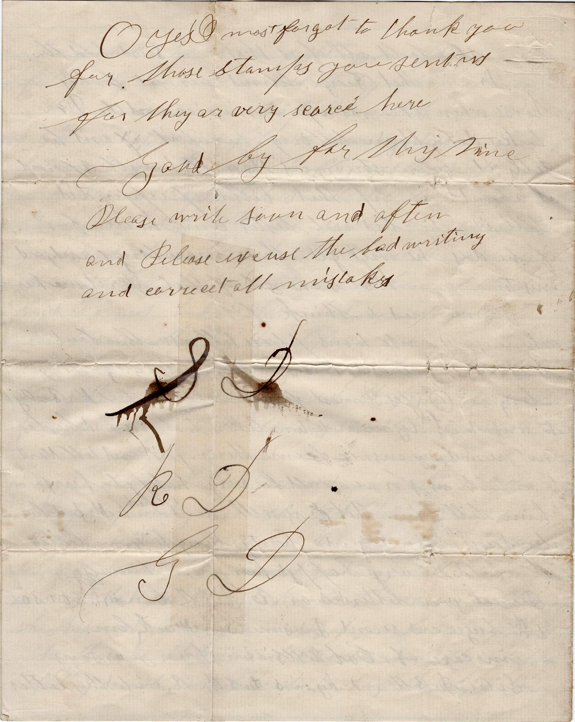 Oh yes. Most forgot to thank you for those stamps you sent us for they are very scarce here. Goodbye for this time. Please write soon and often and please excuse the bad writing and correct mistakes. — S.D., R. D., G. D.