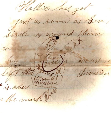 We have not had that awful battle yet which we are expecting every day to commence. It will either be a very great battle, or [ ], surrender, before long because Gen. Halleck has got Beauregard nearly surrounded. Just as soon as Gen. Butler gets in their rear the circle is around them as follows. When Butler comes round with his extreme left (the left is where the dot is on the mark), that will close the circle.