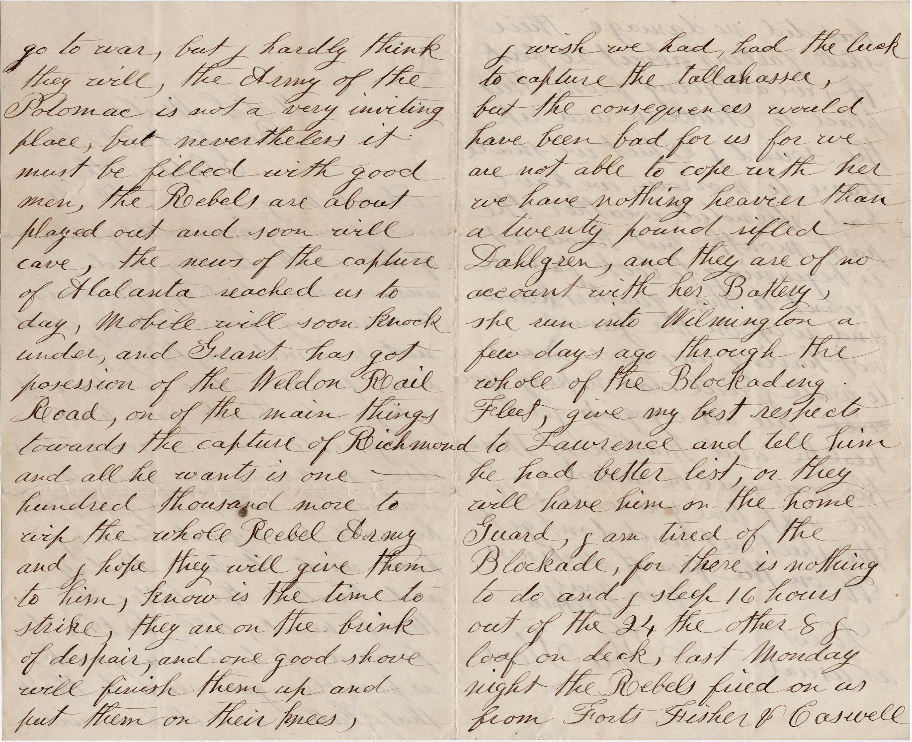 The Rebels are about played out and soon will cave. The news of the capture of Atlanta reached us today. Mobile will soon knock under and Grant has got possession of the Weldon Railroad—one of the main things towards the capture of Richmond—and all he wants is one hundred thousand more [men] to whip the whole Rebel Army and I hope they will give it to him. Now is the time to strike. They are on the brink of despair and one good shove will finish them up and put them on their knees.
