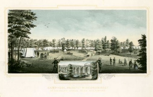 The Relay House is at the Washington Junction of the Baltimore & Ohio Railroad, 9 miles from Baltimore, and 31 from Washington. The regiment is stationed here to guard the road and search trains for deserters and contraband articles. Our camp is on a hill in a cool and shady place.