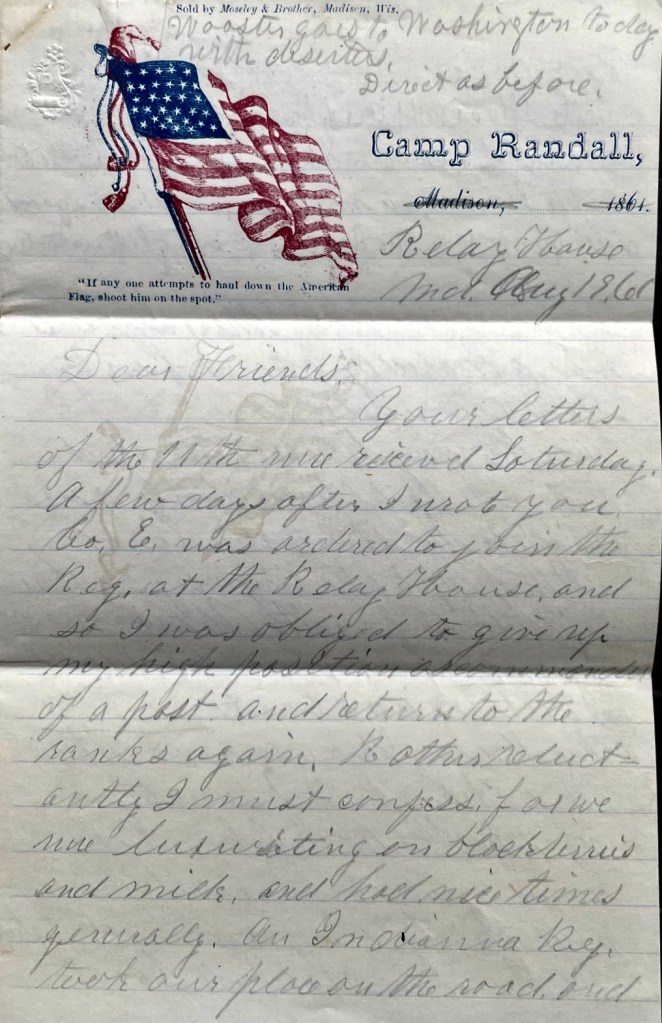 Your letters of the 11th were received Saturday. A few days after I wrote you, Co. E was ordered to join the regiment at the Relay House and so I was obliged to give up my high position as commander of a post and return to the ranks again—rather reluctantly I must confess for we were luxuriating on blackberries and milk and had nice times generally. An Indiana regiment took our place on the road and that night one of their squads was attacked by about 40 secessionists.