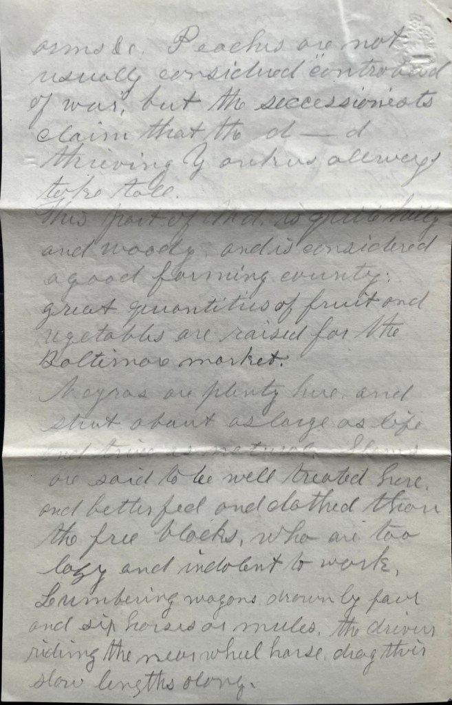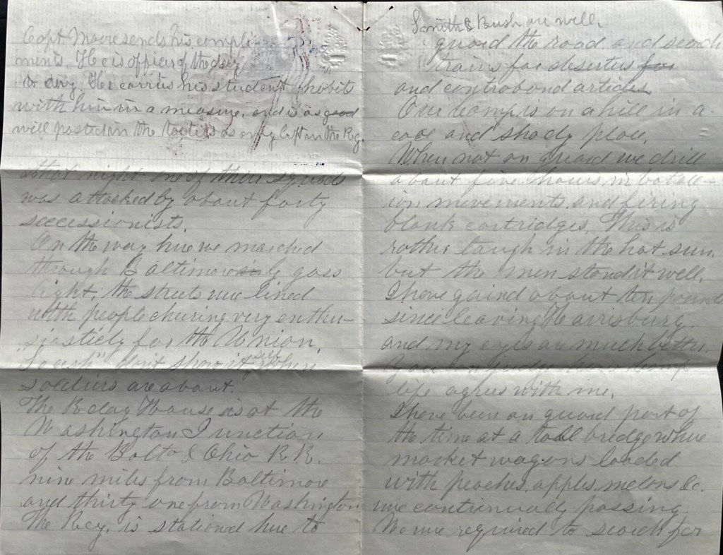 On the way here we marched through Baltimore by gaslight. The streets were lined with people cheering very enthusiastically for the Union. “Secesh” don’t show itself when soldiers are about.