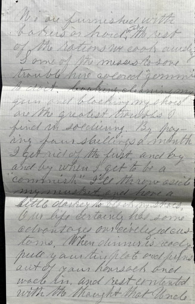 We are furnished with baker’s [bread], or hard tack. The rest of the rations we cook ourselves. Some of the messes to save trouble, hire colored “gemmies” to do it. Cooking, cleaning my gun and blacking my shoes are the greatest troubles I find in soldiering. By paying four shillings a month, I get rid of the first, and by and by when I get to be a “commish,” I’ll throw aside my musket and have a little darkey to black my shoes.