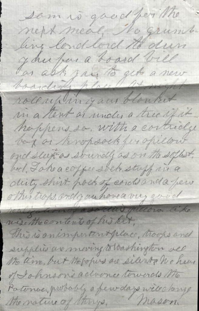 This is an important place. Troops and supplies are moving to Washington all the time but the papers are silent. We hear of Johnson’s advance towards the Potomac. Probably a few days will change the nature of things. — Mason