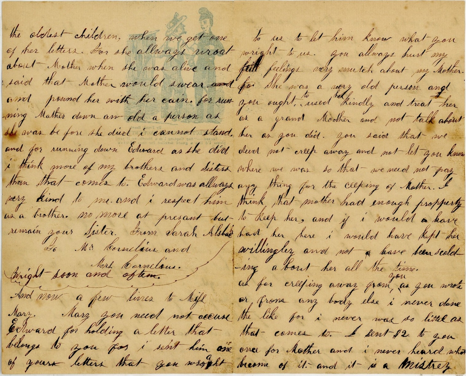 Mary you need not accuse Edward for holding a letter that belongs to you for I sent him one of your letters that you wrote to us to let him know what you write to us. You always hurt my feelings very much about my Mother. She was a very old person and you ought to used her kindly and treated her as a grandmother and not talk about her as you did. You said that we did not creep away and not let you know where we was so that you need not pay anything for the keeping of Mother. I think that Mother had enough property to keep her and if I would have had her here, I would have kept her willingly and not have been scolding about her all the time.