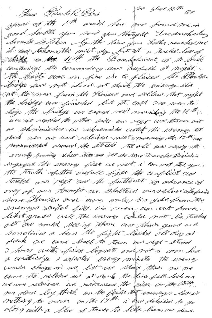 We crossed next morning the 12th. When we reached the other side, our regiment was thrown out as skirmishers. We skirmished with the enemy til dark when we were relieved. Next morning, the 13th, we maneuvered around the streets til all was ready, the enemy pouring shell into us all the time. French’s Division engaged the enemy first. We next. I cannot tell you the truth of that awful fight. The conflict was terrible. Our regiment was the furthest in advance of any of our troops. We sheltered ourselves behind some houses and were only 50 yards from the enemy’s rifle pits. Our men were cut down like grass while the enemy could not be touched. All we could see of them was their guns and sometimes a head.