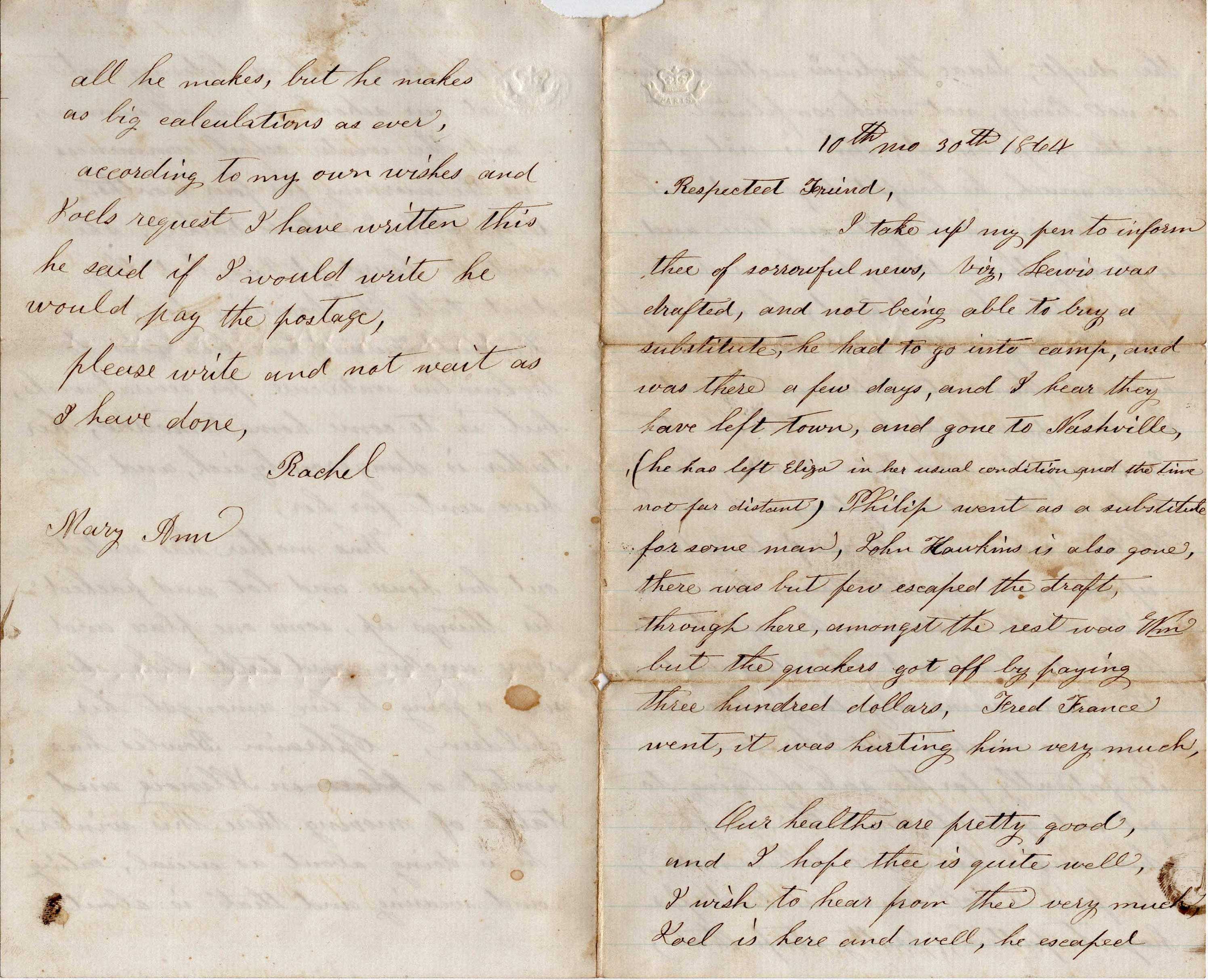 I take up my pen to inform thee of sorrowful news—viz: Lewis [Wiseman] 1 was drafted, and not being able to buy a substitute, he had to go into camp and was there a few days, and I hear they have left town and gone to Nashville (he has left Eliza in her usual condition and the time is not far distant). Philip went as a substitute for some man. John Hawkins is also gone. There was but few escaped the draft through here. Amongst the rest was William but the Quakers got off by paying three hundred dollars. Fred France went. It was hurting him very much.