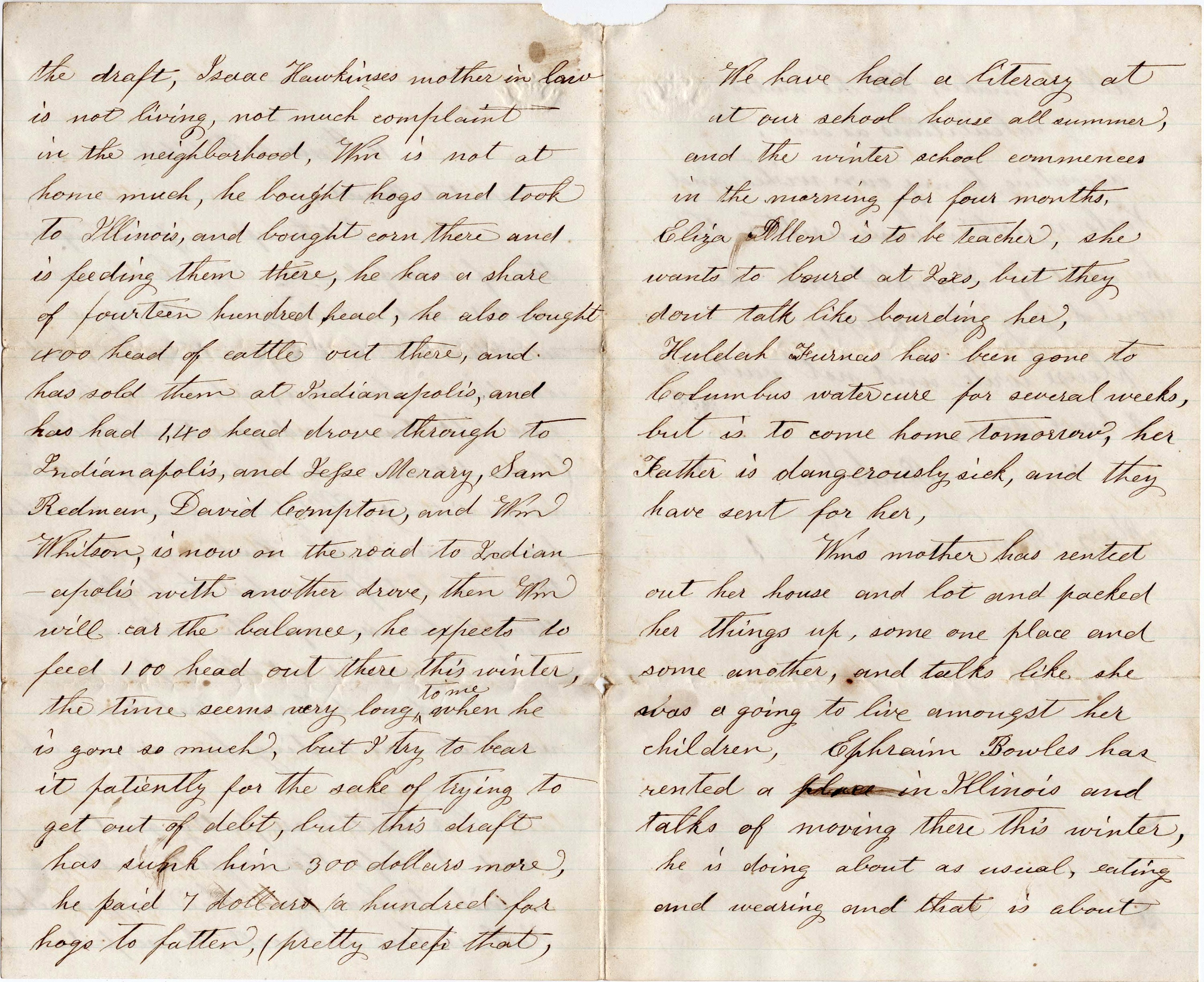 Our healths are pretty good and I hope thee is quite well. I wish to hear from thee very much. Joel is here and well. He escaped the draft. Isaac Hawkins’s mother-in-law is not living—not much complaint in the neighborhood. William is not at home much. He bought hogs and took to Illinois and bought corn there and is feeding them there. He has a share of fourteen hundred head. He also bought 400 head of cattle out there and has sold them at Indianapolis and has had 140 head drove through to Indianapolis, and Jesse Merary, Sam Redman, David Compton, and William Whitson, is now on the road to Indianapolis with another drove. Then William will car the balance. He expects to feed 100 head out there this winter. The time seems very long to me when he is gone so much but I try to bear it patiently for the sake of trying to get out of debt. But this draft has sunk him 300 dollars more. He paid 7 dollars a hundred for hogs to fatten (pretty steep that).