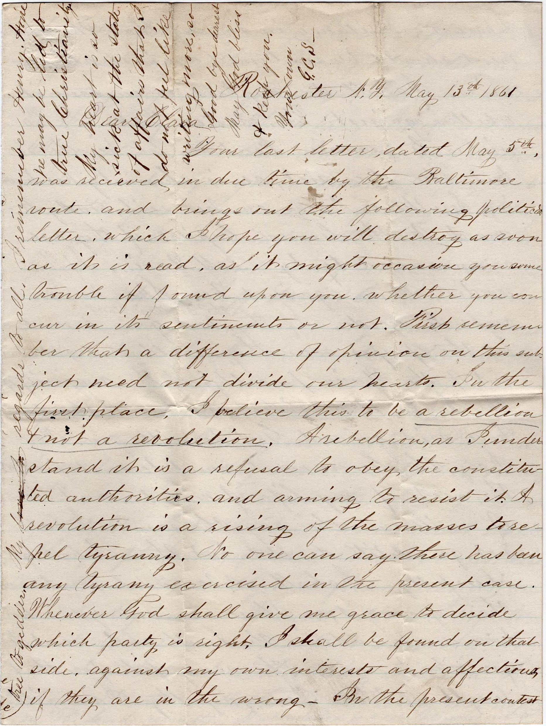 Your later letter, dated ay 5th, was received in due time by the Baltimore route and brings out the following political letter which I hope you will destroy as soon as it is read as it might occasion you some trouble if found upon you, whether you concur in its sentiments or not. First, remember that a difference of opinion on this subject need not divide our hearts. In the first place, I believe this to be a rebellion and not a revolution. A rebellion, as I understand it, is a refusal to obey the constituted authorities, and aiming to resist it. A revolution is a rising of the masses to repel tyranny exercised in the present case. Whenever God shall give me grace to decide which party is right, I shall be found on that side, against my own interests and affections, if they are in the wrong.